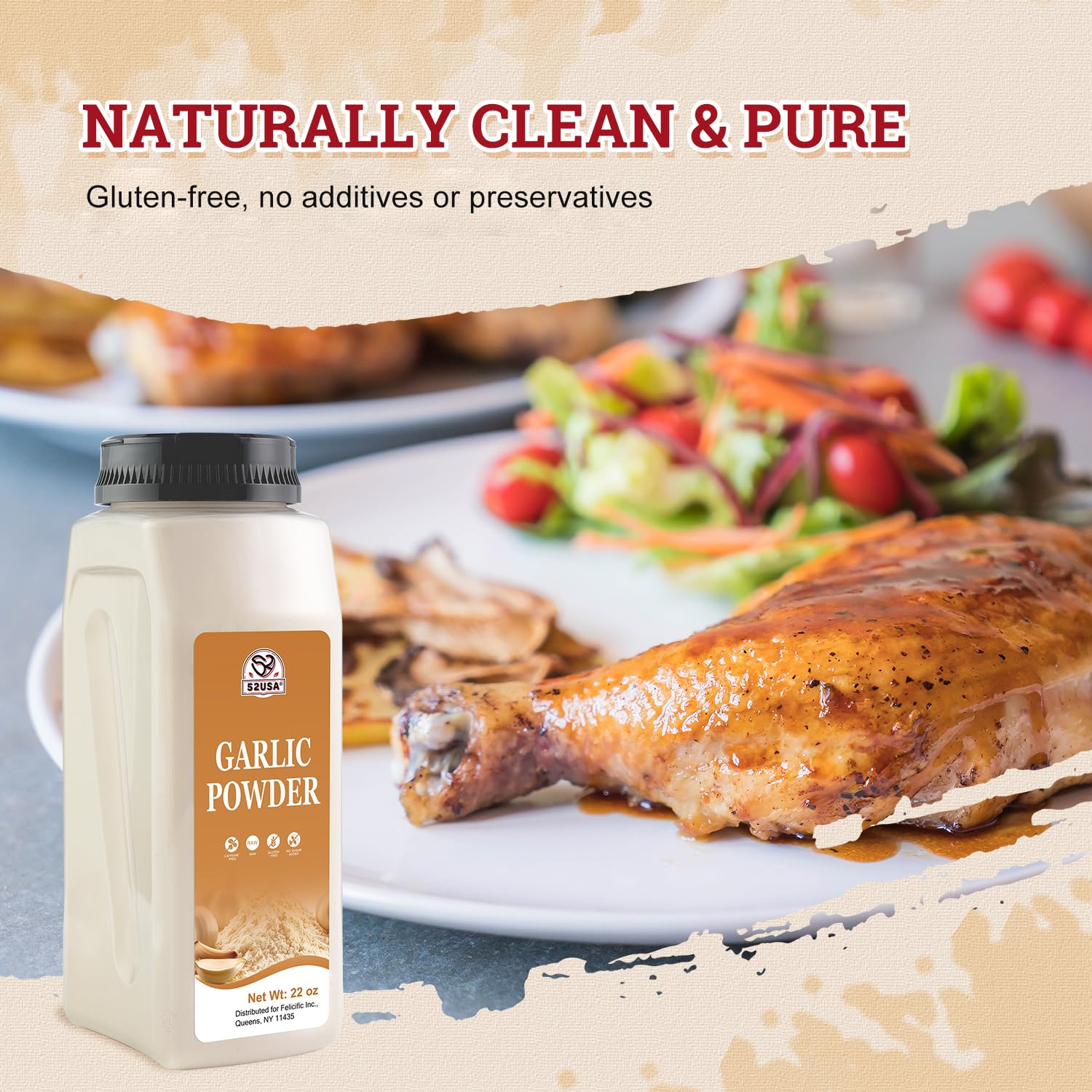 Authentic and Pure Flavor: Selected from 100% pure natural fresh garlic free of genetically modified and gluten-free the resealable packaging helps preserve the flavor of the spices minimizes waste and ensures consistent quality. | Versatile Garlic Seasoning: Our garlic seasoning carefully dried and ground pairs easily with beef chicken pork vegetables pasta or dry rubs to enhance the flavor of the delicacies. | The flavor of a relaxed blend: The classic garlic powder offers a strong garlic flavor a hint of saltiness and a subtle sweetness easily endowing dishes with bold and unique flavors and astonishing the entire dining experience. | Convenient & Consistent: Enjoy fresh garlic flavor at any time without the prep. Our garlic powder offers a smooth texture and consistent taste perfect for everyday meals. | Bulk 24.64oz Resealable Pouch: Large food-grade BPA-free pouch designed to preserve freshness aroma and flavor while offering great value for home and professional kitchens.