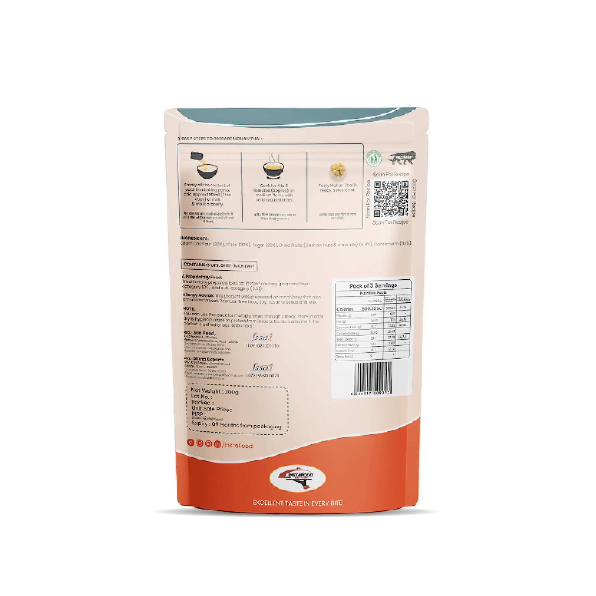 Q: How many servings does one pack of INSTAFOOD Mohanthal provide?A: Each 200g pack of INSTAFOOD Mohanthal yields approximately 400g of ready-to-eat dessert, providing 3-4 servings. This makes it ideal for sharing with family or enjoying on special occasions.