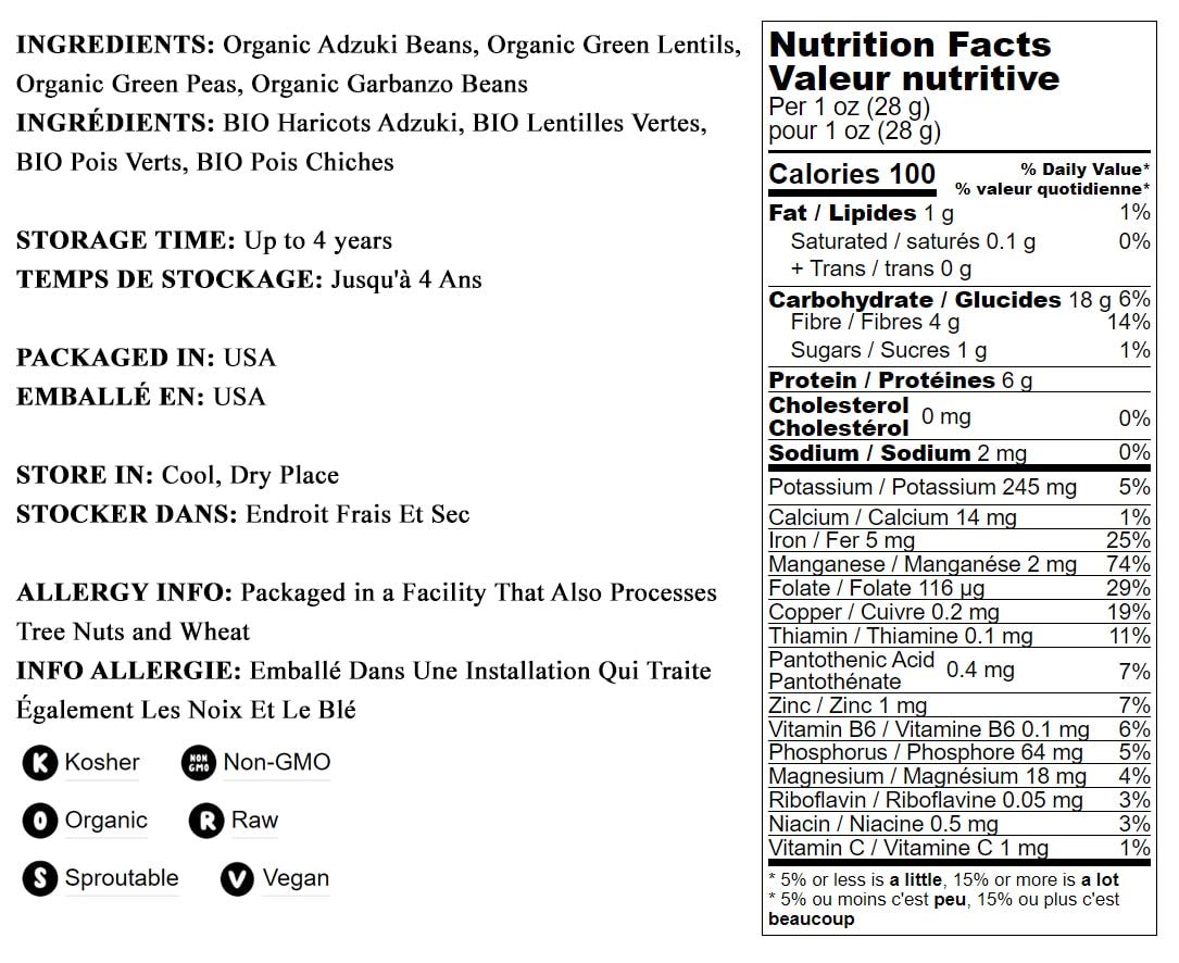 Ingredients: Organic Green Pea, 25%; Organic Adzuki, 25%; Organic Lentil, 25%; Organic Garbanzo, 25%. This flavorful blend of organic beans is great as a fresh snack, in salads, soups, and it can be mixed into a variety of other meals to give them a healthy crunch. The organic beans are ideal for people who are on weight-loss diet, since they are low in fat and high in protein. The high-protein content makes you feel full for long and the low-fat content helps in limiting calorie intake. Nutritional Information: Being high in protein, Crunchy Organic Sprouts contain all the essential amino acids. They are also high in iron, calcium, phosphorous, potassium, vitamins A, C, E, niacin and folate. Country of Origin: Organic Adzuki Beans (China, USA), Organic Lentils (USA),Organic Green Peas (USA), Organic Garbanzo Beans (Mexico)