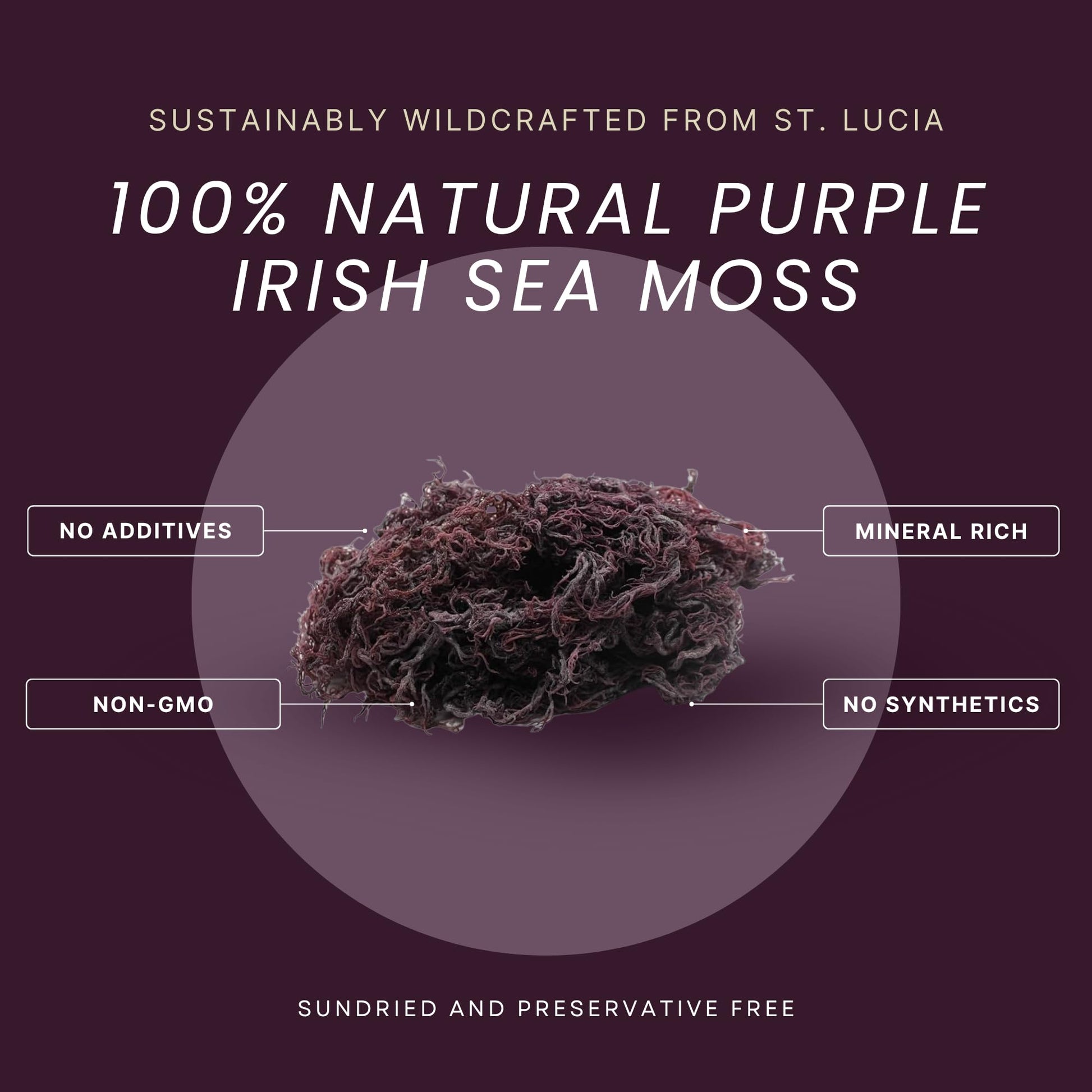 Our rare, wild-crafted purple/green sea moss is imported fresh from the remote Caribbean island of St. Lucia. Sea moss is a natural source of calcium, magnesium, Iron, B vitamins, amino acids and a whole host of minerals, vitamins and antioxidants. The sea moss is meticulously harvested and dried to maintain its color benefits. Users will notice the purple moss will have a much stronger ocean smell and taste than gold sea moss. Due to the careful process of it being harvested to maintain its color, the sea water is not rinsed off so users may notice a light coating of dried salt on the surface. This is normal as it is just dried saltwater. Absolutely nothing is added to the sea moss. 100% NATURAL.