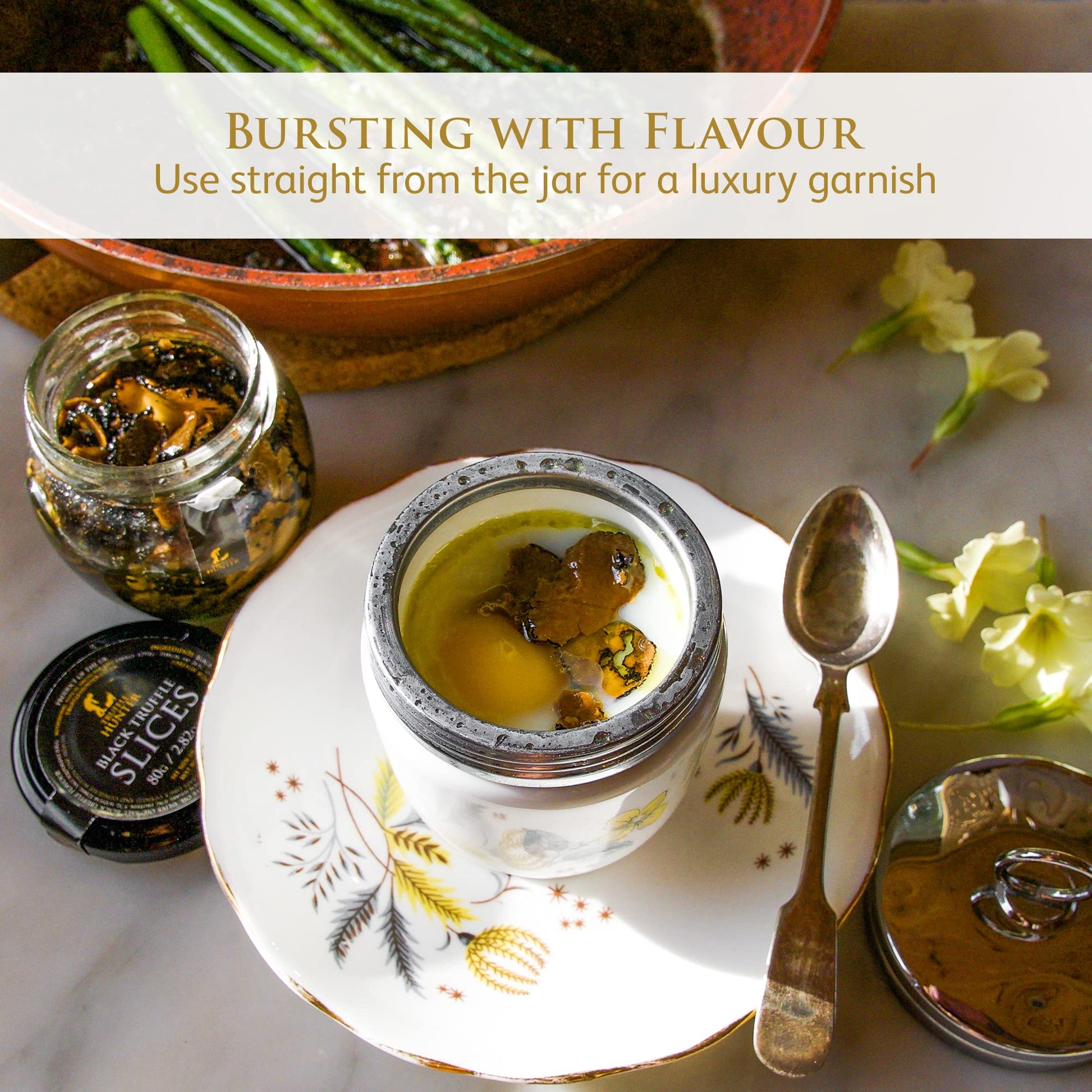 - Q: What are black truffle slices and how do I use them? A: Black truffle slices are thinly sliced pieces of black truffles preserved in high-quality extra virgin olive oil. They can be used as a luxurious garnish for various dishes, adding a rich aroma and earthy flavor. Simply add a few slices straight from the jar to enhance the taste of your culinary creations.