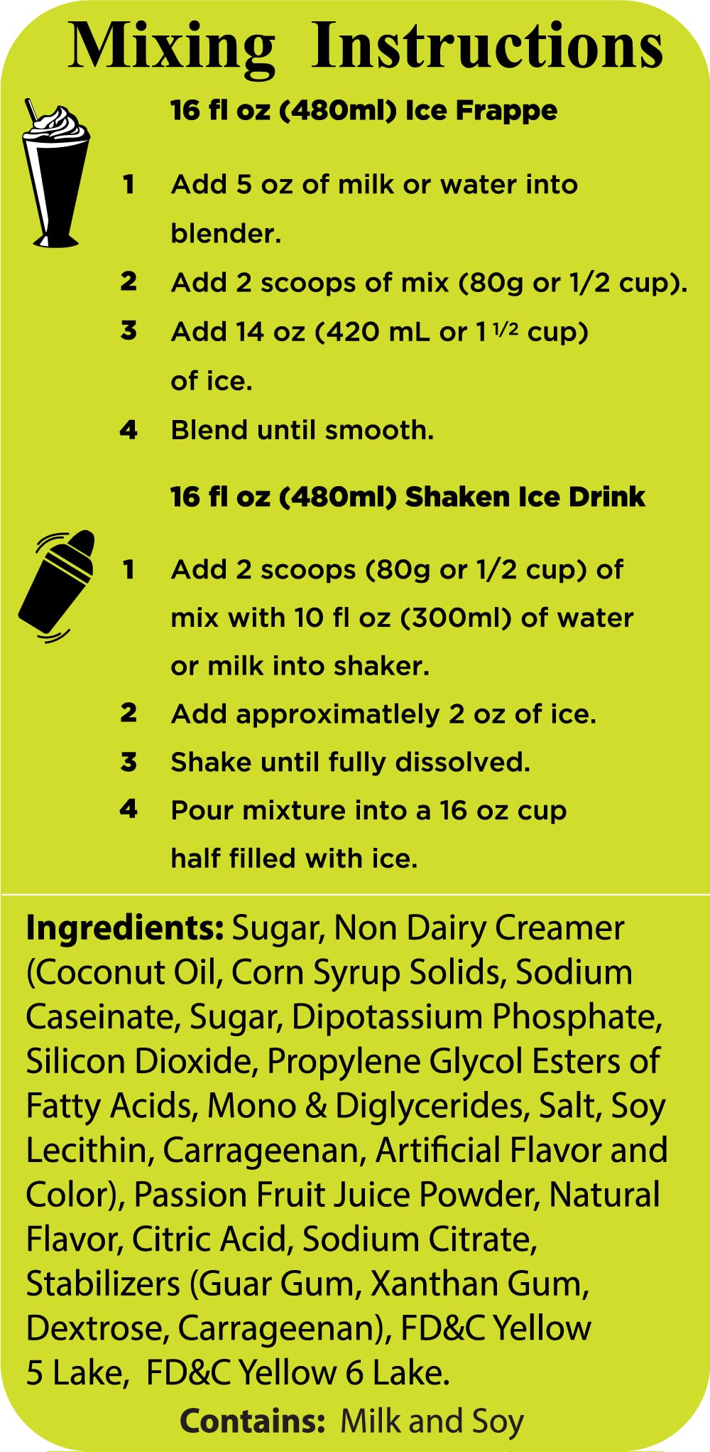 - Q: What is the best way to prepare drinks using the Passion Fruit Frappe Powder Mix? A: To prepare drinks with the Passion Fruit Frappe Powder Mix, simply add water or milk to the mix. For best results, blend the mixture for a smooth texture, and you can serve it hot, iced, or blended as a frappe.