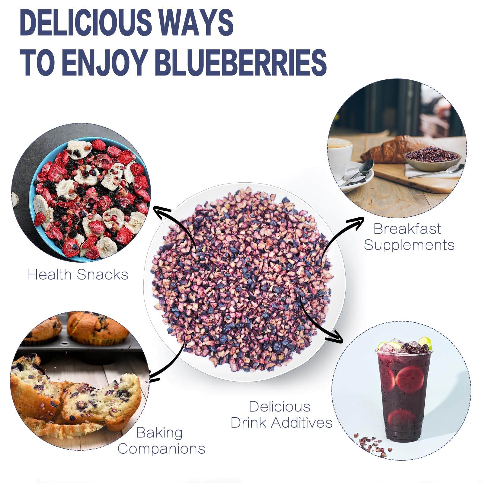- Q: What are some creative ways to enjoy freeze-dried blueberries? A: You can enjoy freeze-dried blueberries in numerous ways: add them to salads, mix them into smoothies, use them in cocktails, or enjoy them straight from the jar as a healthy snack. Their unique flavor and texture make them a delightful addition to a variety of dishes.