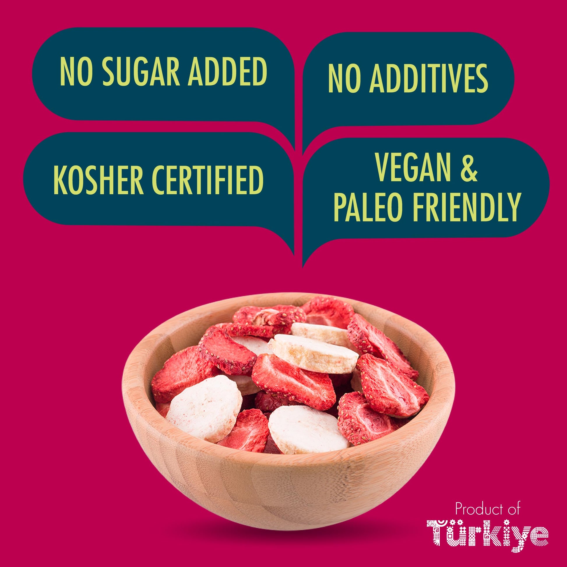 Q: What ingredients are in MAG Frozen Fruit Snacks?A: MAG Frozen Fruit Snacks are made from 100% natural freeze-dried fruits, including apples, strawberries, cinnamon apples, and bananas. There are no added sugars, preservatives, or artificial ingredients, making them a healthy snack option.