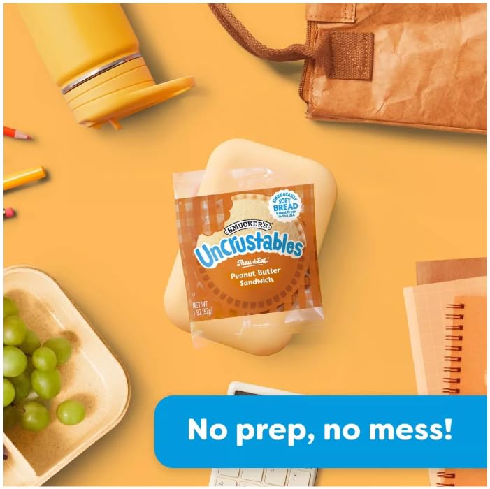 Make busy days a little more doable with Uncrustables - the easiest kid-approved snack and lunch food ever. Just grab one from the freezer in the morning, and its thawed and ready to make your kids day by lunchtime. No fuss. No crust. Just The Best Part of the Sandwich, with the yummiest tastes and textures. The outside of is surprisingly soft white bread, and the inside is packed with 30% more peanut butter than our regular 2 oz. peanut butter and grape jelly sandwich. Wondering how a frozen sandwich could possibly be so delicious? The bread is baked fresh in the U.S.A., and the sandwiches are frozen on the spot to seal in that just-made taste. They also contain no high-fructose corn syrup. Basically theyre super-convenient snacks and lunch foods you can feel good about, and that kiddos will happily eat. Try the Uncrustables Peanut Butter.