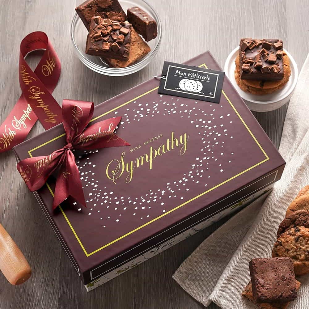 - Q: What types of treats are included in the Broadway Basketeers Deluxe Condolence Sympathy Gift Basket? A: The gift basket includes a variety of 44 individually wrapped treats such as Chocolate Ganache Brownies, Chocolate Fudge Brownies, Peanut Butter Fudge Brownies, Chocolate Chunk Blondies, and a selection of cookies including Oatmeal Raisin and Mint Chocolate Chip.