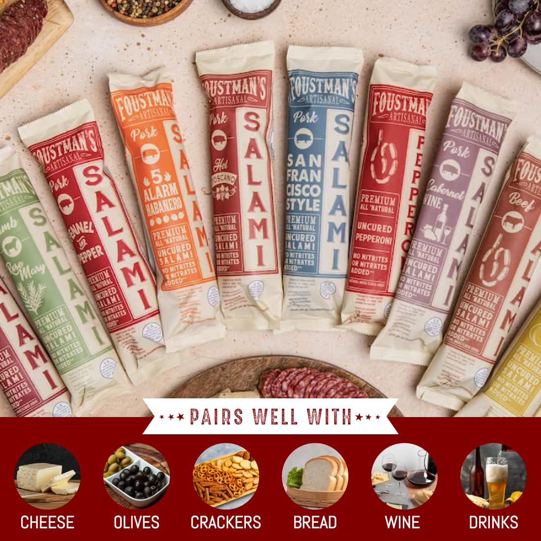 Q: What are some ways to enjoy Foustman's Salami?A: Foustman's Salami can be enjoyed on charcuterie boards, paired with cheese, olives, and crackers, or used to enhance various dishes such as salads, pasta, or deli meat trays.