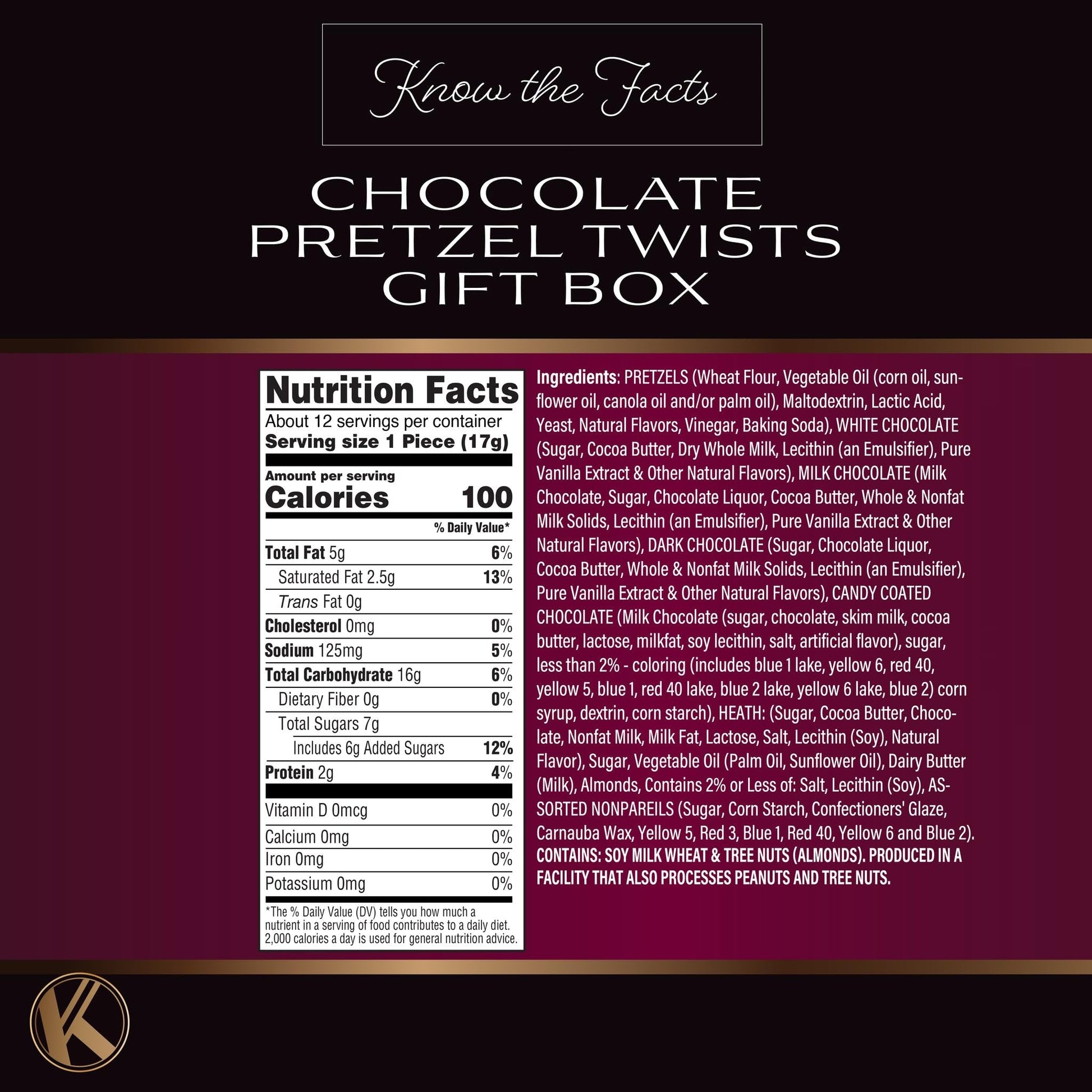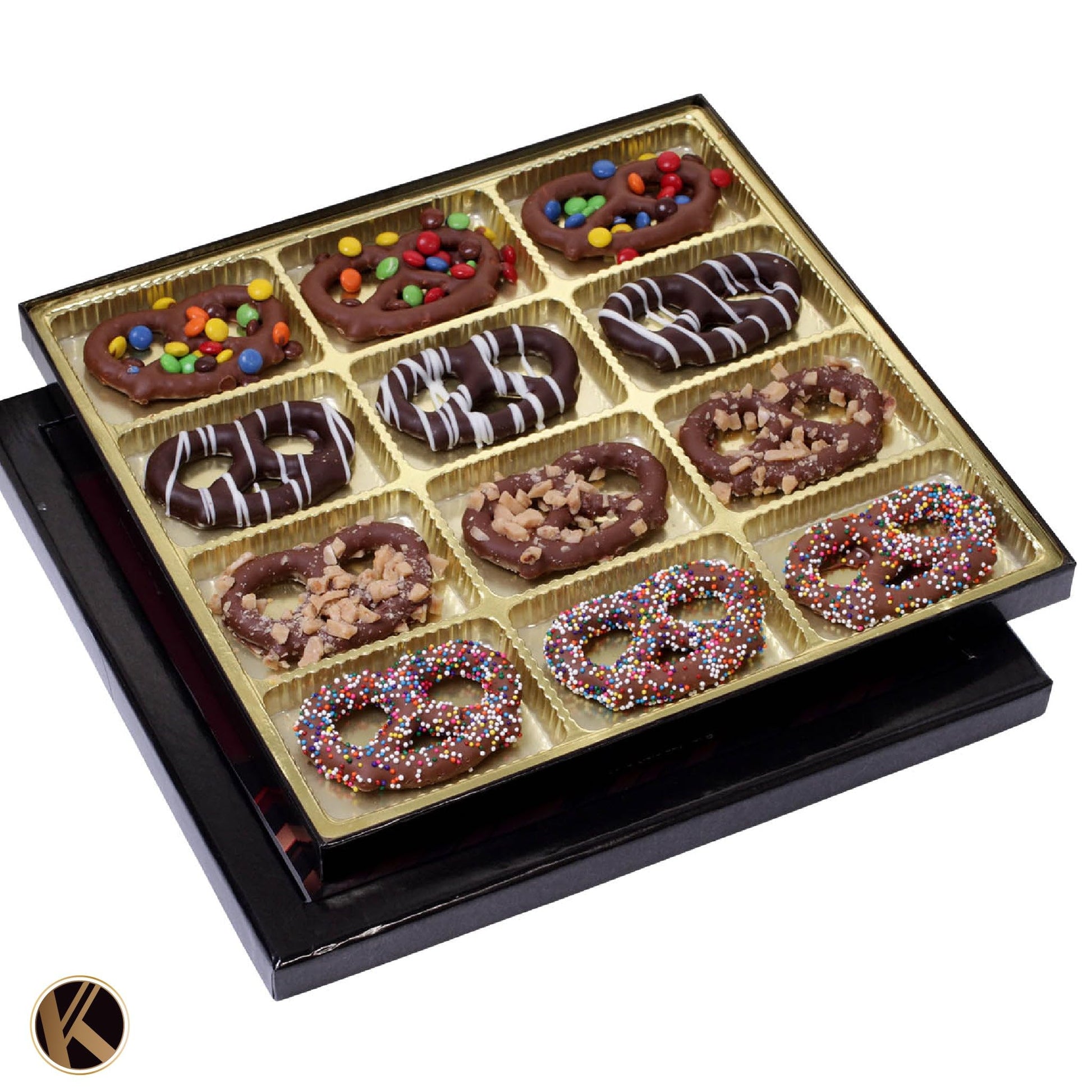 - Q: What is included in the KREMERY Chocolate Covered Pretzel Twists gift basket? A: The KREMERY Chocolate Covered Pretzel Twists gift basket includes a set of 12 pretzel twists, each coated in a blend of chocolates and topped with a variety of delicious toppings, making it a delightful mix of flavors and textures.