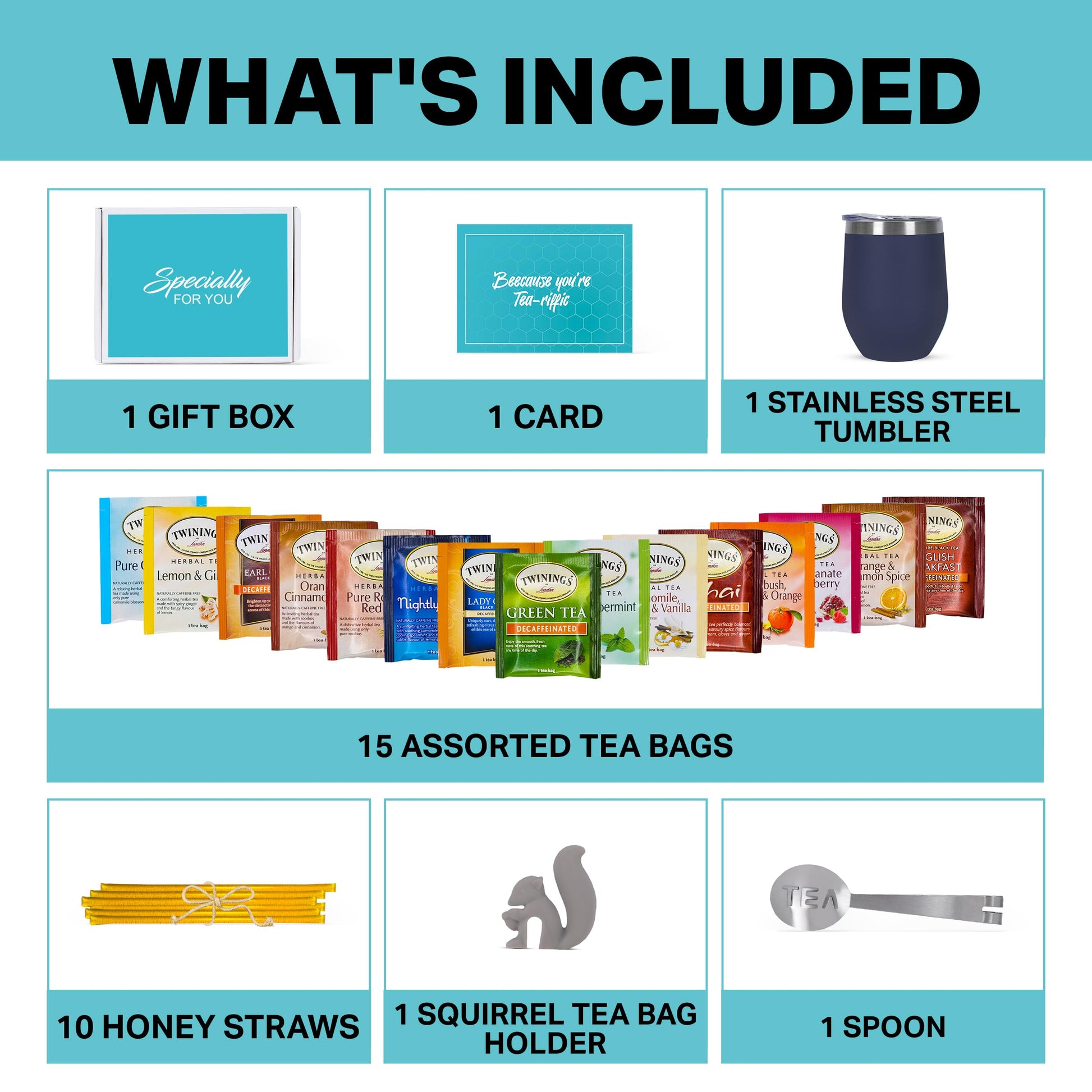 Tea Kit Gift Set - Presented In A Beautiful Tea Basket Gift Box. Modern Elegance'S Tea And Honey Gift Set Includes A 12Oz Vacuum Insulated Tumbler; With A Bpa-Free Sliding Lid. A Tea Collection Gift Set Sampler Of 15 Different Teas (Herbal, Green, White, Black And Decaf), 10 Natural Pure Raw Honey Straws, A Tea Spoon Squeezer, A Cute Squirrel To Hold Your Tea Bag And A Greeting Card To Write A Personal Message. Each Item Was Carefully Selected, Designed And Packaged In The Usa To Make This The Perfect Gift For Tea Lovers Or As A Feel Better Get Better Soon Care Package, Including Mothers Day Gifts, Gifts For Mom.