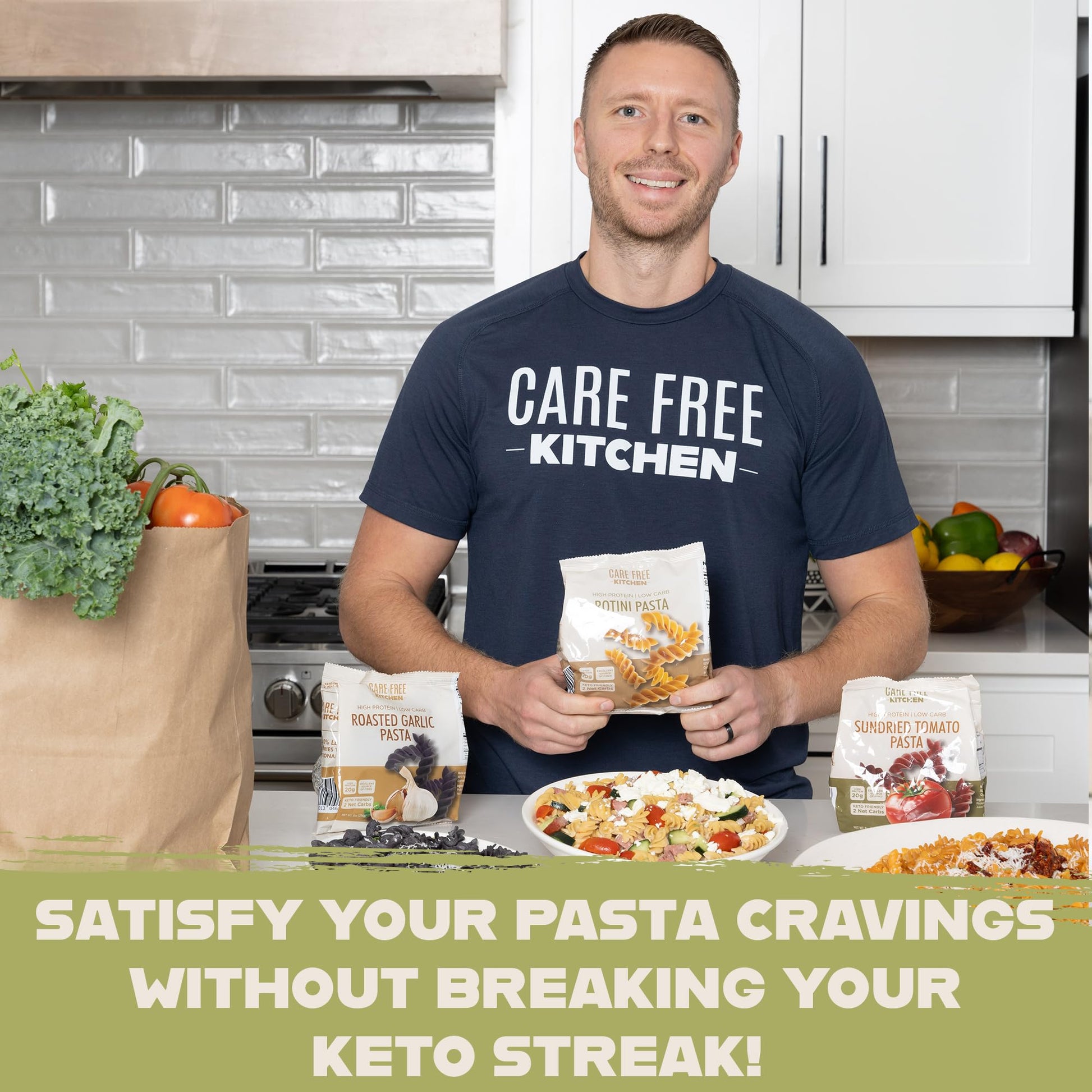 - Q: What makes Care Free Kitchen pasta different from traditional pasta? A: Care Free Kitchen Sundried Tomato Rotini is a low carb, high protein alternative to traditional pasta. It contains 40% fewer calories and is made with simple ingredients like resistant wheat starch and wheat protein isolate, offering a healthier option without sacrificing taste.