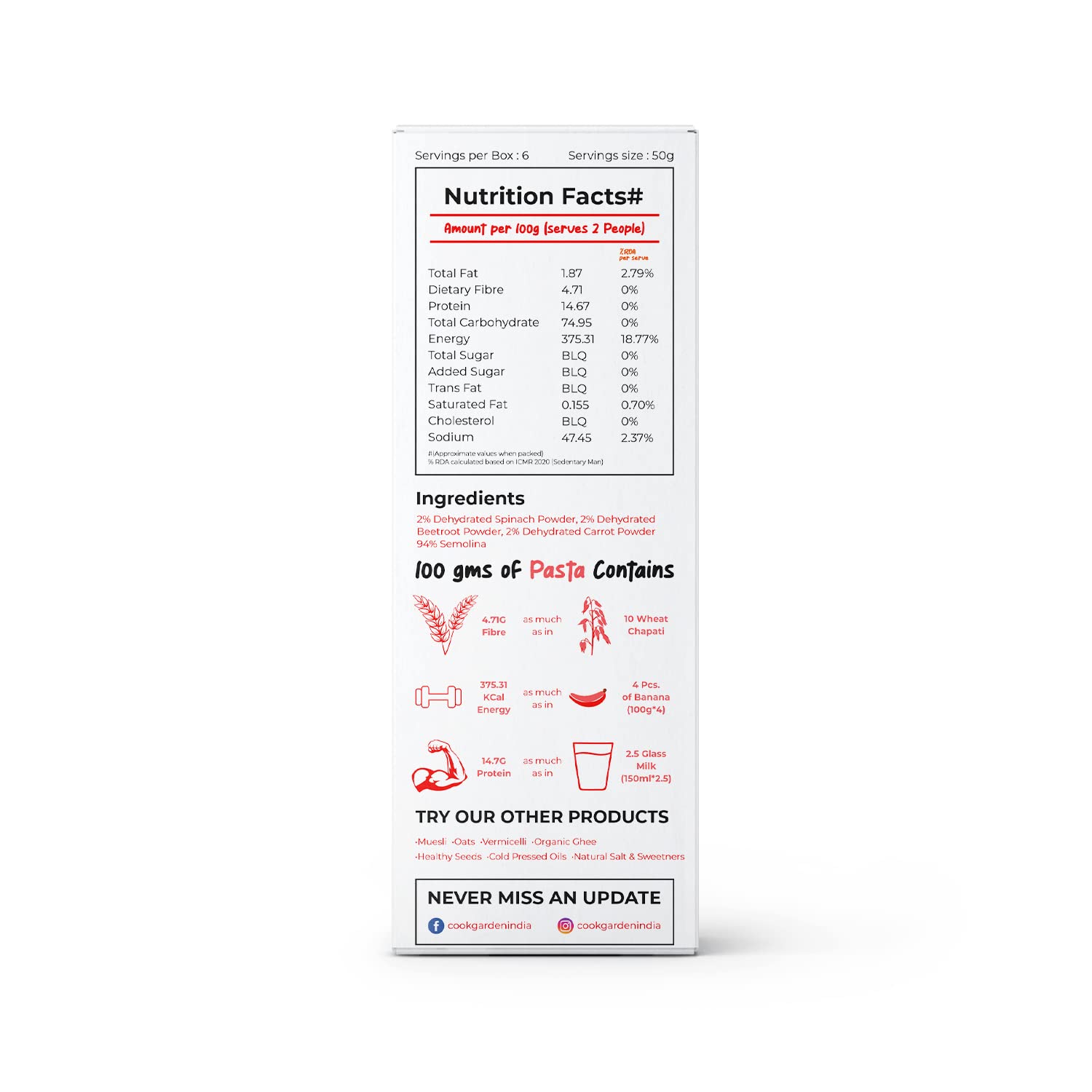 Q: What are the main ingredients in CookGarden Multi Veggie Penne Pasta?A: CookGarden Multi Veggie Penne Pasta is made from organic semolina and infused with the goodness of beetroot, carrot, and spinach. This unique blend not only adds vibrant color but also provides essential nutrients.