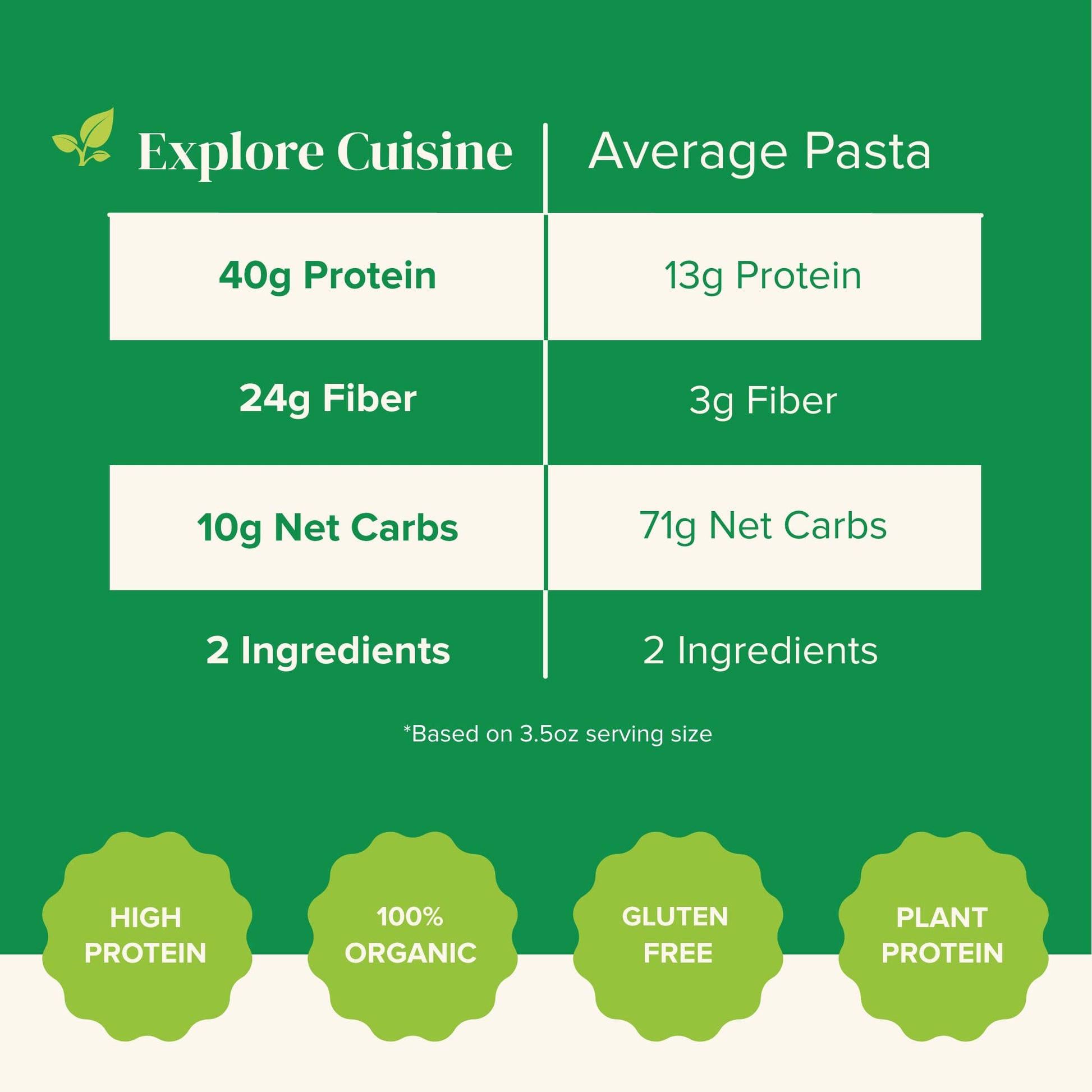 Q: How much protein and fiber does this pasta contain?A: Each 3.5-ounce serving of Explore Cuisine Organic Black Bean & Sesame Fettuccine contains 40g of protein and 24g of fiber, providing a nutrient-dense alternative to traditional pasta.