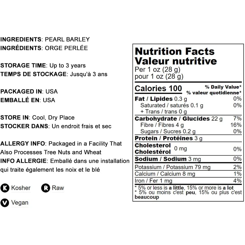 As far as whole grain cereals go, pearled barley is one of the healthiest and most delicious. Its a great choice for breakfast as it helps keep your blood sugar levels normal and gives you a huge boost of energy that will keep you going till lunch. Cultivated for over 10,000 years, barley has been the favored food of many cultures. Today Food to Live brings top-quality natural pearled barley to your home so you can enjoy its taste and benefits. Nutritional Value The high content of dietary fiber is one of the reasons why Pearled Barley is such a healthy food. It also provides your body with an infusion of important minerals, especially manganese, selenium and copper. Directions Cooked barley can be combined with a variety of fruits and vegetables, and you can even mix it with other grains. You can add it to soups, stews and salads. This product is processed in a facility that also processes tree nuts and wheat.