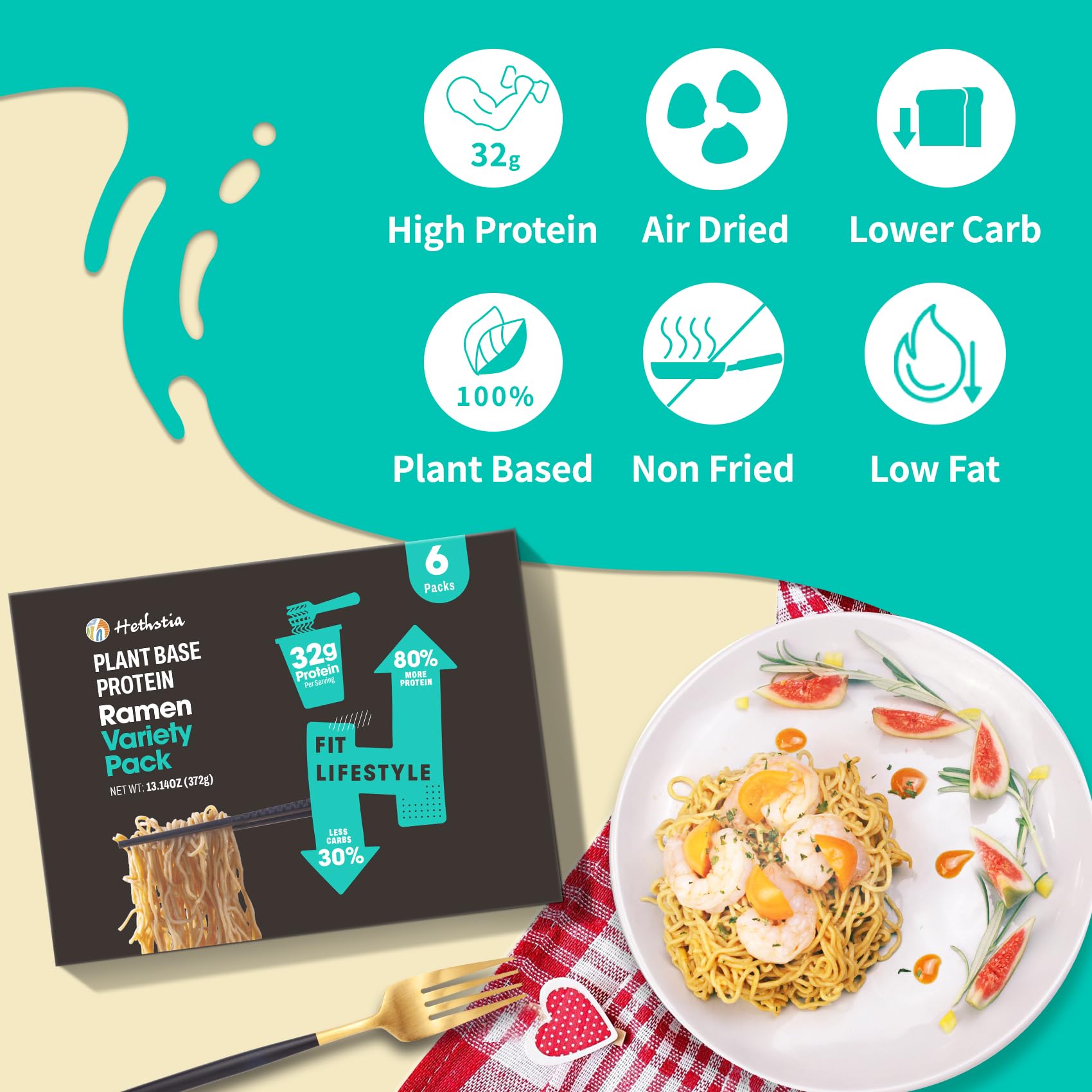 Q: How much protein does each serving of Hethstia Instant Ramen provide?A: Each serving of Hethstia Instant Ramen Soup Cup delivers 31 to 32 grams of plant-based protein, making it a nutritious choice for those looking to maintain a healthy lifestyle.