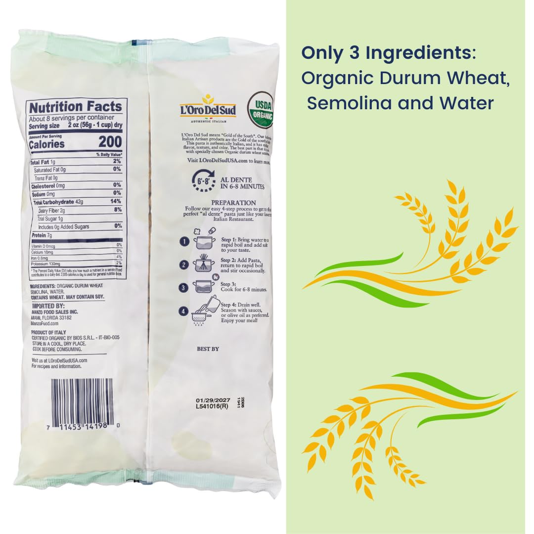 Q: What is L'Oro Del Sud Organic Cavatappi Pasta made from?A: L'Oro Del Sud Organic Cavatappi Pasta is made from 100% organic durum wheat, ensuring a premium quality and exceptional taste that is perfect for your favorite sauces.