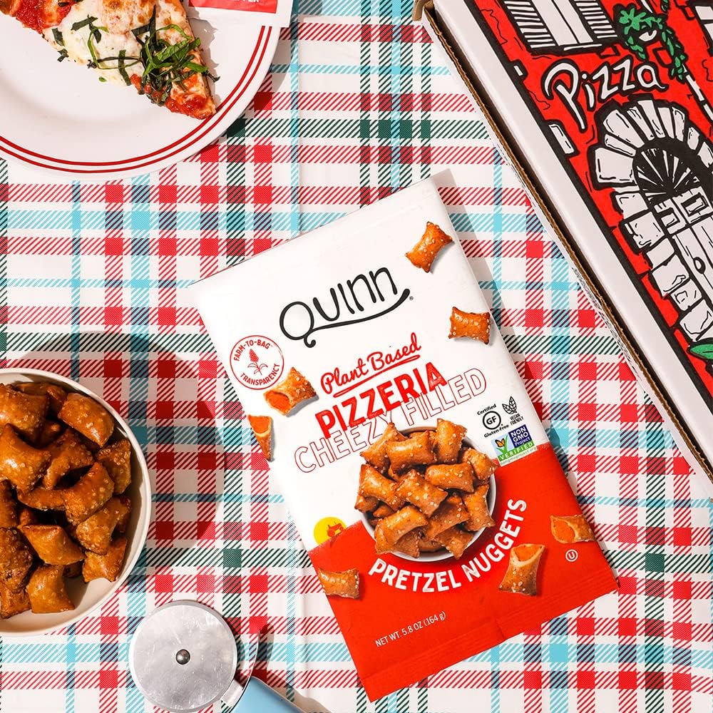 Q: What are the main ingredients in Quinn Gluten Free Pizzeria Cheezy Filled Pretzel Nuggets?A: Quinn Gluten Free Pizzeria Cheezy Filled Pretzel Nuggets are made with real ingredients, including whole grain sorghum and root vegetables. They are filled with a savory cheese-like filling and topped with sea salt.