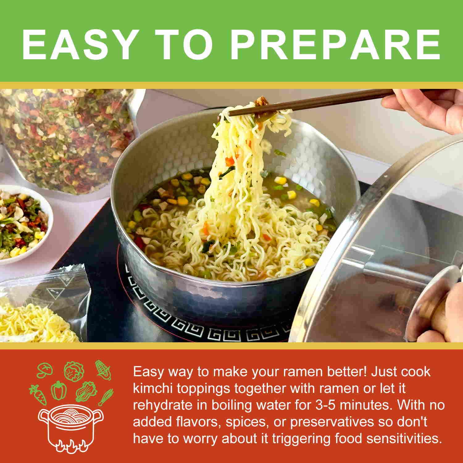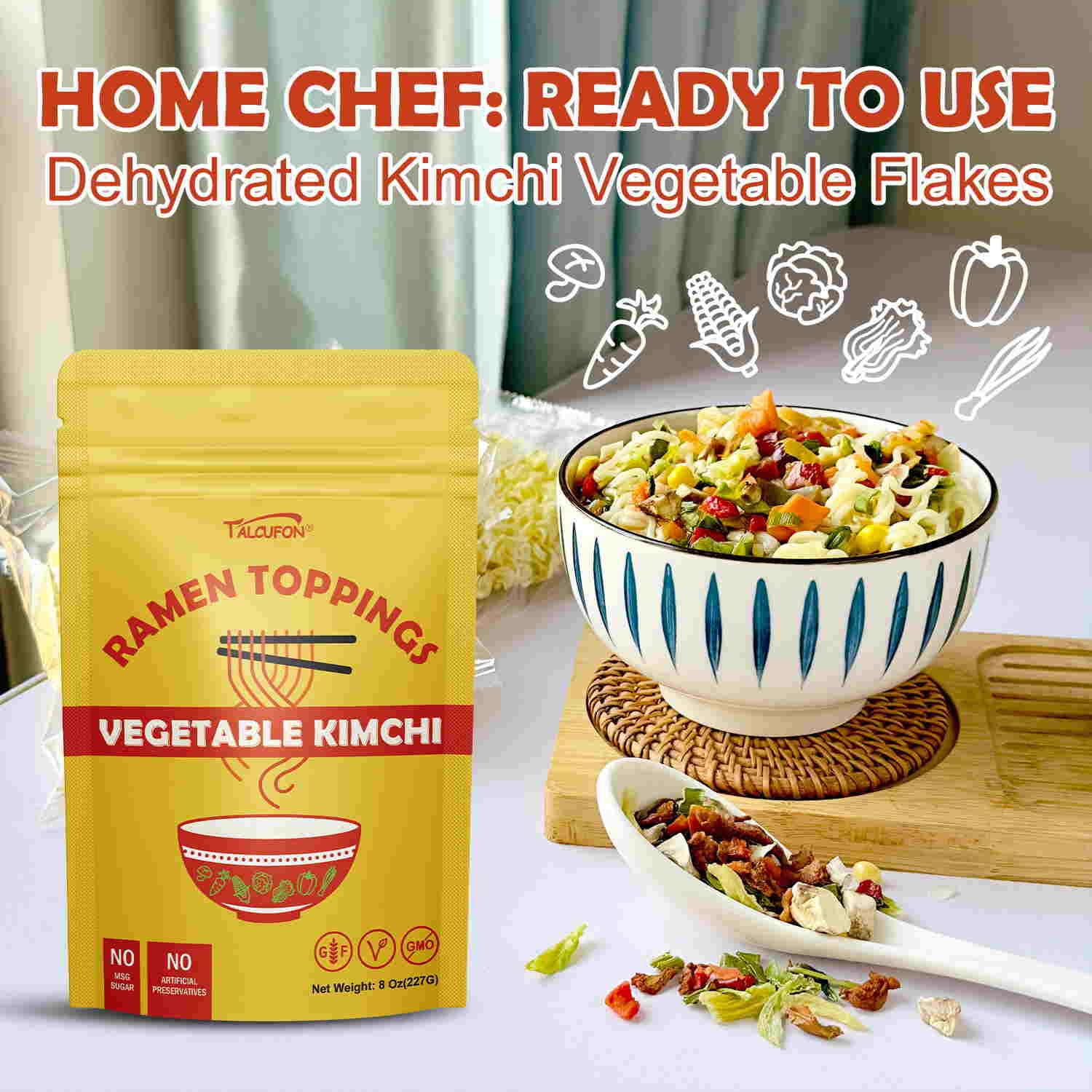 Q: What are TALCUFON Ramen Toppings made of?A: TALCUFON Ramen Toppings are made from dehydrated dried kimchi vegetable flakes, which combine the bold, spicy flavors of traditional kimchi with a variety of fresh vegetables. They are all-natural, vegan, gluten-free, and allergen-free.