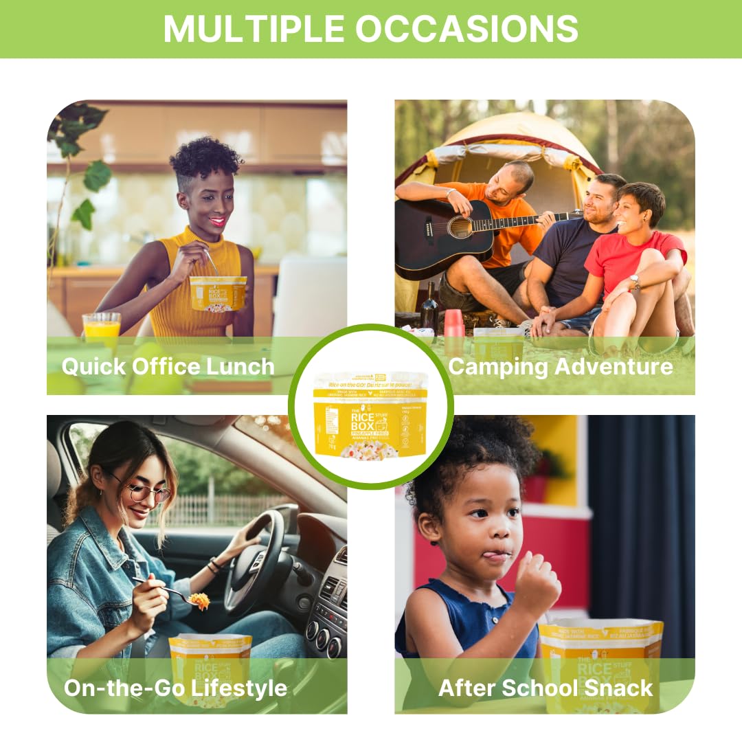 Introducing The Rice Stuff Box Instant Rice Meals—a delicious and convenient solution to your busy lifestyle. Whether you’re at home, work, or adventuring on the go, our meals are here to satisfy your hunger with wholesome, natural ingredients and bold, exciting flavors. Each of our rice meals is made with organic jasmine rice, the foundation of our perfectly balanced dishes. We’ve meticulously crafted each variety with ingredients that not only taste amazing but also align with your dietary needs and ethical values. Pineapple Fried Rice is a tropical treat with sweet, juicy dried pineapple, savory garlic seasoning, and a delightful mix of vegetables like carrots, corn, and spring onion. Its a vegan, gluten-free option made with no GMOs, MSG, preservatives, or added colors. If you crave a little more spice in your life, Thai Red Curry offers an aromatic journey through Southeast Asian cuisine. The red curry seasoning, made with coconut milk powder, garlic, and spices, brings a fiery yet comforting flavor to every bite. It’s also completely vegan, dairy-free, and gluten-free. For those seeking a heartier, savory meal, the Chicken Mushroom variety offers a rich umami experience with shitake mushrooms and a perfectly seasoned chicken-flavored sauce. This gluten-free, dairy-free meal is packed with wholesome ingredients and absolutely no preservatives, MSG, or added colors. Our meals are designed to be quick and easy to prepare, perfect for the modern lifestyle. Whether you’re fueling up after a workout, need a fast lunch at work, or are seeking a comforting meal during camping trips, The Rice Stuff Box has you covered. No matter which flavor you choose, you can rest assured knowing that all our meals are made with the highest quality ingredients, aligned with ethical and health-conscious values. From NON-GMO certifications to being completely vegan (for Pineapple Fried and Thai Red Curry), and gluten-free, our meals are crafted for your wellness. Indulge in pure, natural goodness with The Rice Stuff Box—meals that are good for you and the planet!
