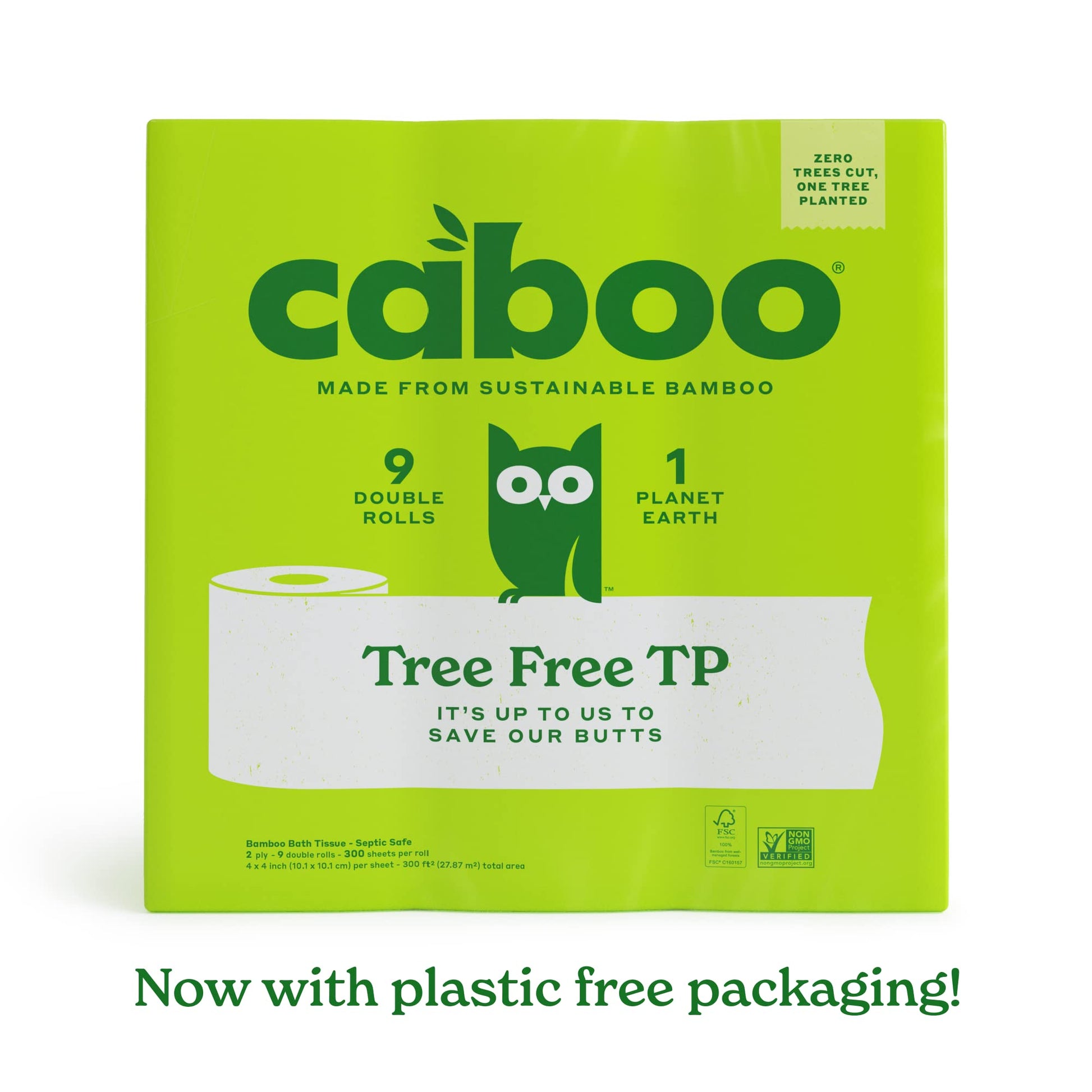 Caboo Tree Free Bamboo Toilet Paper, Plastic Free, Eco Friendly, Septic Safe, Biodegradable Bath Tissue with Soft, Quick Dissolving 2 Ply Sheets (300 Sheets Per Roll, 9 Double Rolls)