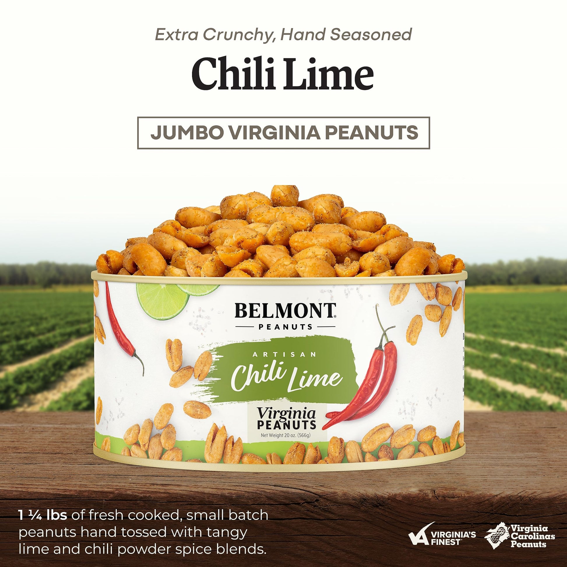 - Q: What makes Belmont Peanuts Gourmet Chili Lime Virginia Peanuts unique? A: Belmont Peanuts are hand-seasoned with a blend of real ingredients, including chili and lime, providing a distinct citrusy and spicy flavor that sets them apart from other snacks. They are made from jumbo-sized Virginia peanuts, known for their exceptional crunch and natural flavor.