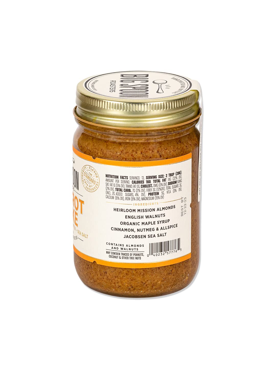 Q: What are the main ingredients in Big Spoon Roasters Carrot Cake Almond Butter?A: Big Spoon Roasters Carrot Cake Almond Butter is made with heirloom Mission almonds, lightly toasted English walnuts, cinnamon, nutmeg, allspice, maple syrup, and Jacobsen Sea Salt, all of which contribute to its unique flavor and texture.