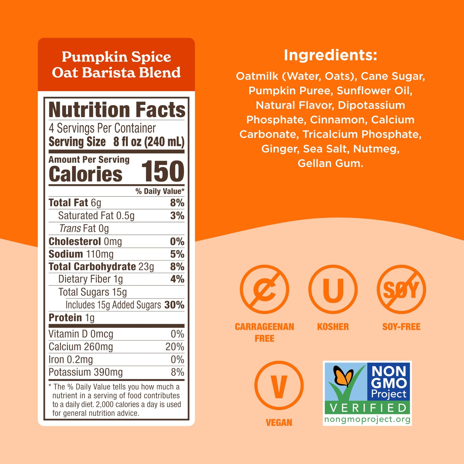 Pumpkin Spice Oat Barista Blend steams and froths into perfect Pumpkin Spice Lattes. The rich autumn flavors come from simple, plant-based ingredients including real pumpkin puree and spices. Just steam or froth and add to espresso. Enjoy!