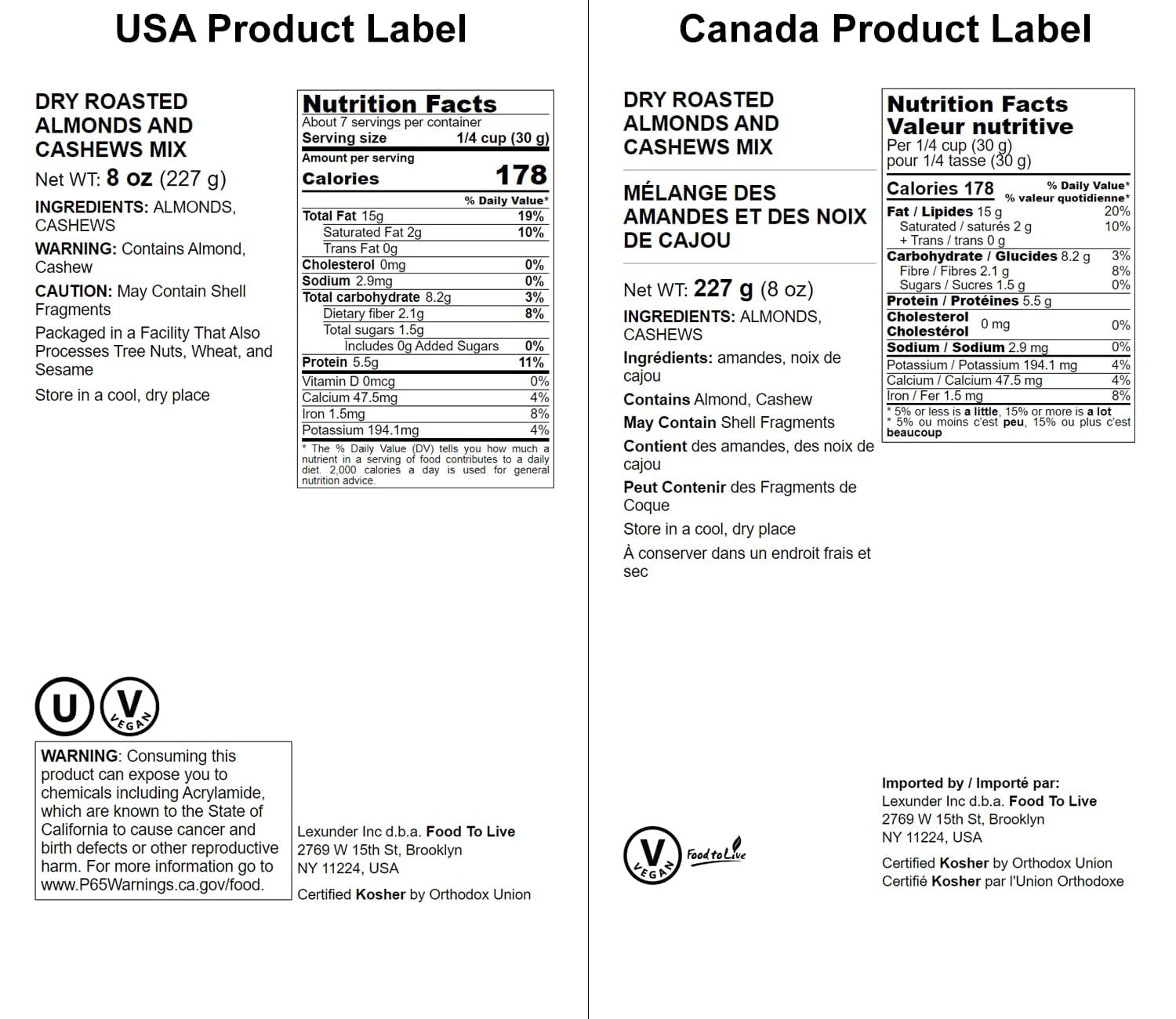 Savor The Irresistible Crunch And Natural Goodness Of Dry Roasted Almonds And Cashews Mix From Food To Live. Expertly Roasted In The Usa, It Combines The Rich Flavors Of Almonds And Cashews Into A Protein-Packed Snack That'S Perfect For Munching On The Go Or Adding A Delightful Crunch To Your Favorite Recipes. Brimming With Essential Nutrients Like Copper, Magnesium, Phosphorus, Zinc, Vitamin E, And Riboflavin, This Unsalted Blend Offers A Guilt-Free Indulgence. Whether You'Re Hitting The Trails, Sprinkling It Over Salads, Or Incorporating It Into Granolas And Desserts, This Versatile Mix Is A Must-Have For Nut Enthusiasts. Enjoy The Unbeatable Freshness And Crunchiness That Lasts Up To 1.5 Years When Stored Properly. Elevate Your Snacking Experience With This Irresistible Dry Roasted Almonds And Cashews Mix From Food To Live.