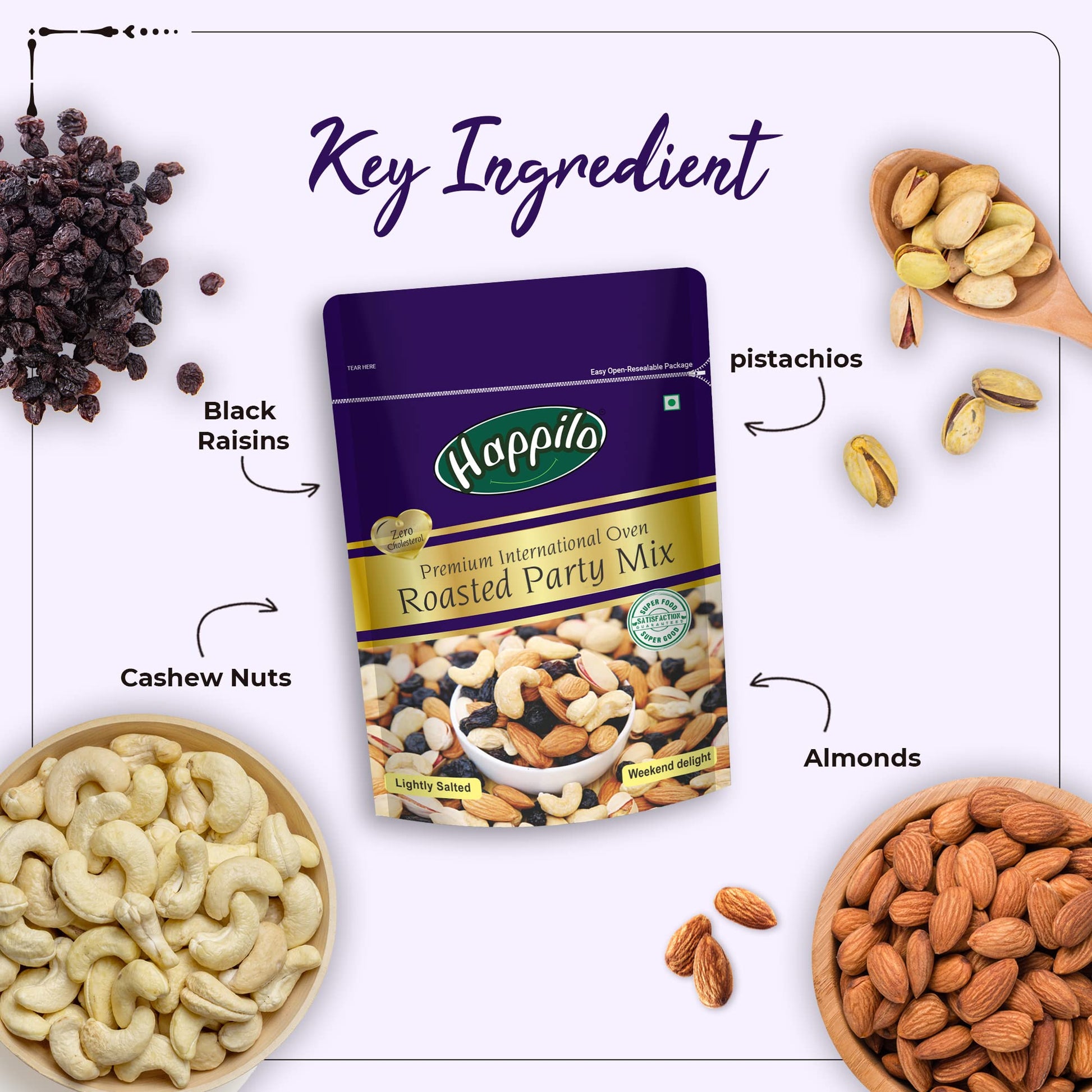 - Q: What are the main ingredients in Happilo Premium International Salted Partymix? A: Happilo Premium International Salted Partymix contains a blend of healthy dry fruits, including Kaju (cashews), Kishmish (raisins), Badam (almonds), and Pista (pistachios). These ingredients are oven-roasted to maintain their nutritional value.