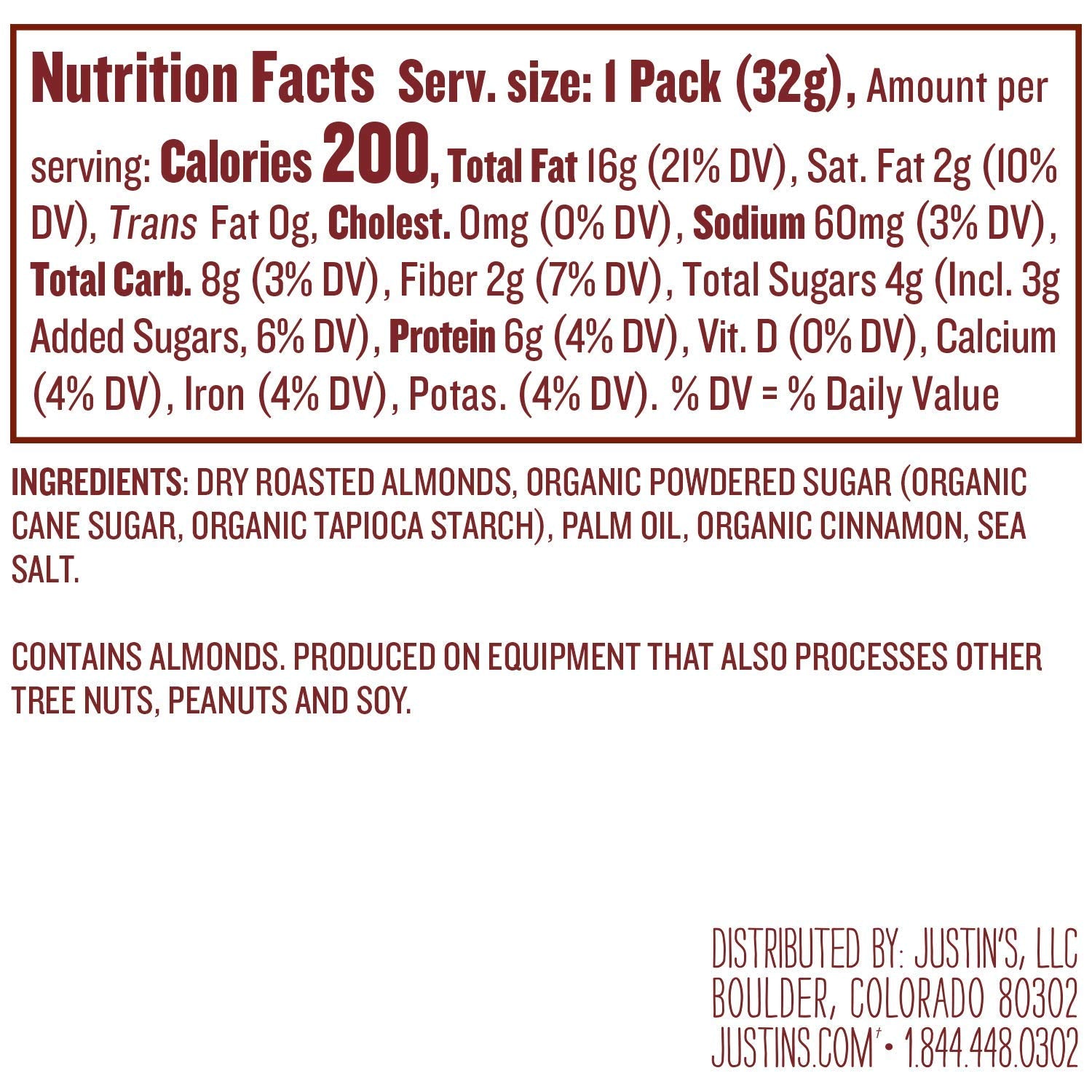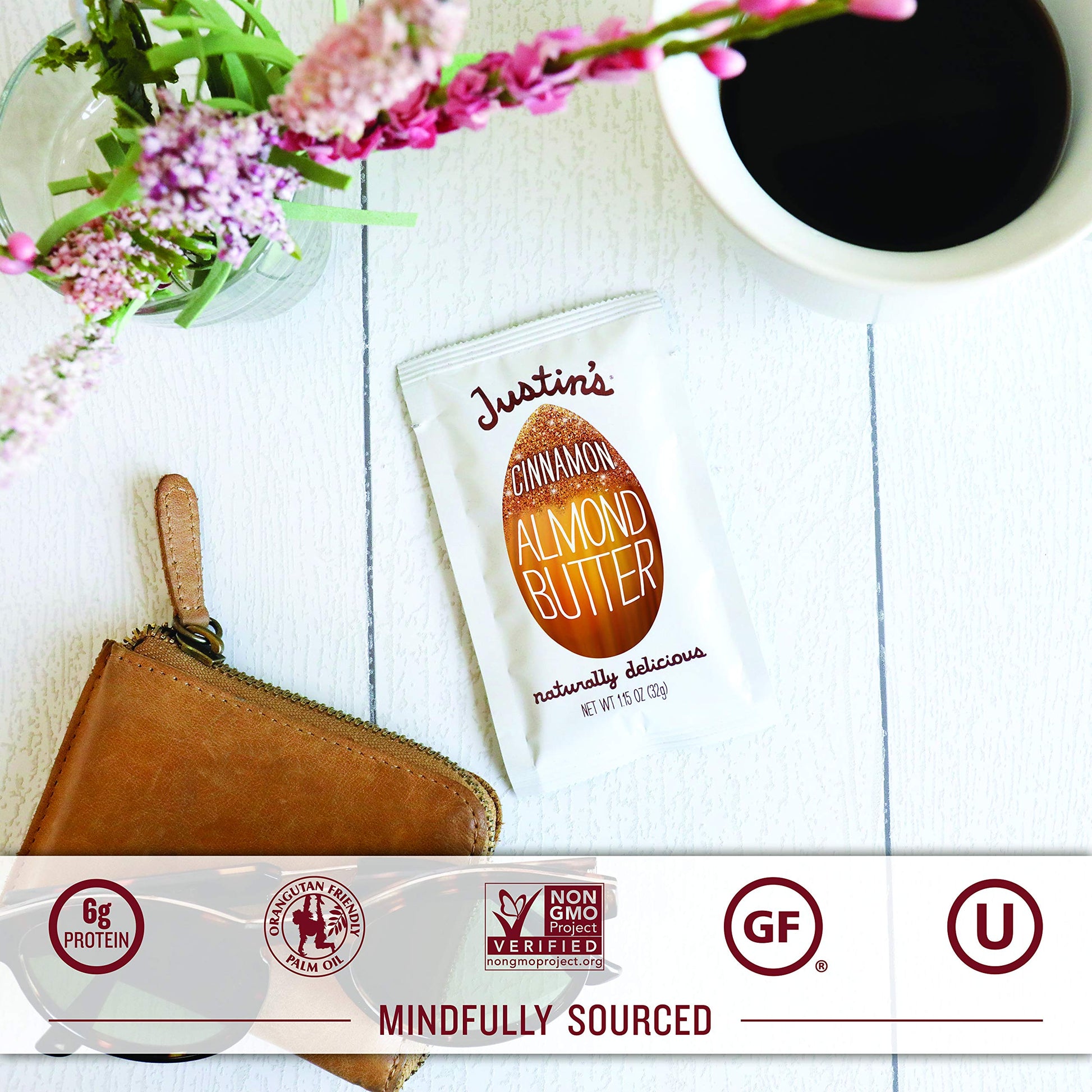 Q: What are the main ingredients in Justin's Cinnamon Almond Butter Squeeze Packs?A: Justin's Cinnamon Almond Butter Squeeze Packs are made from high-quality organic cinnamon and almonds, along with responsibly sourced orangutan friendly palm oil. The product is gluten-free, non-GMO, and contains no trans fats.