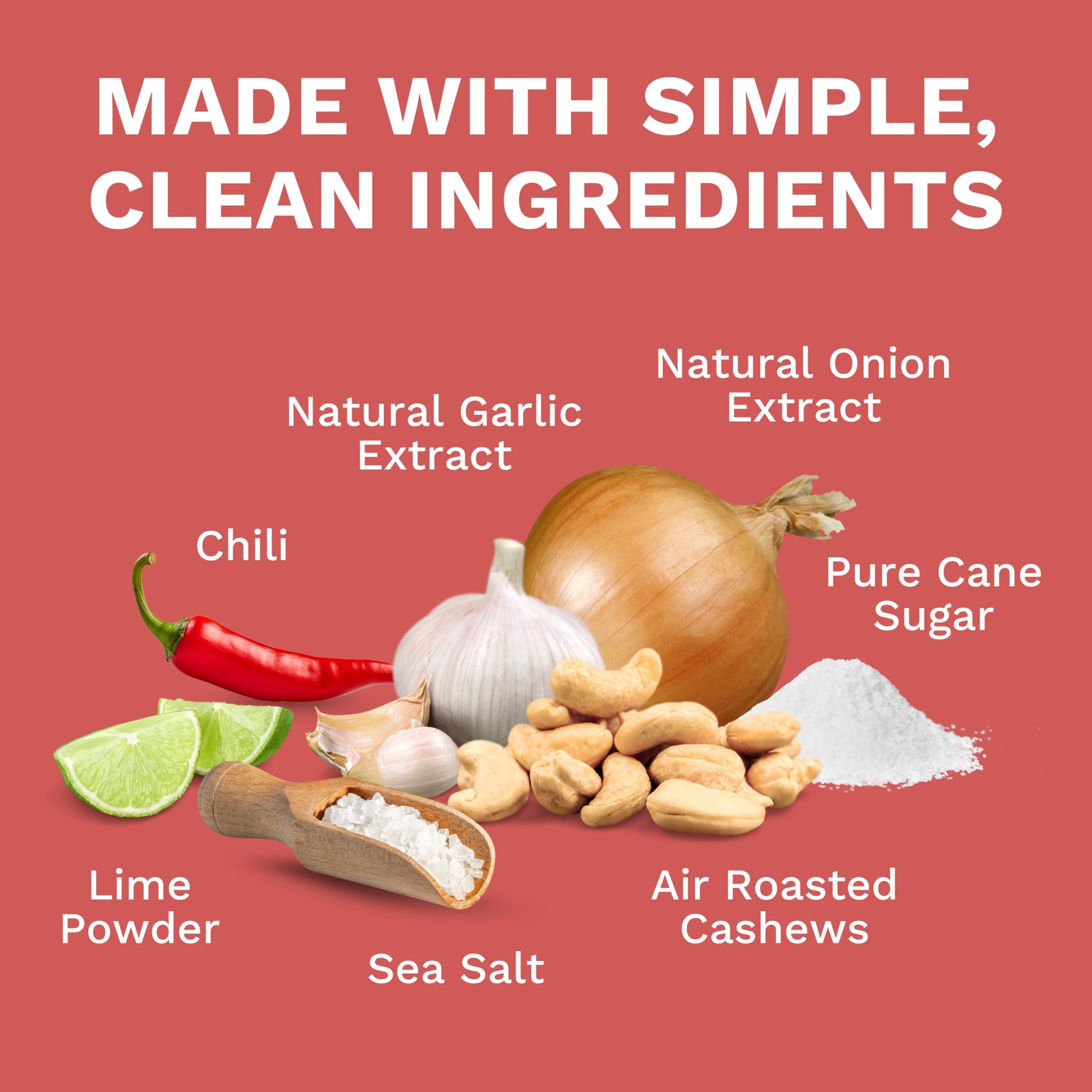 - Q: What makes the Peri Peri Chili Spiced Cashews different from regular cashews? A: The Peri Peri Chili Spiced Cashews are coated with a unique blend of spices, including chili, onion, garlic, lime, and sea salt. This enhances the robust, buttery flavor of the cashews, offering a savory and spicy snack experience that sets them apart from regular cashews.