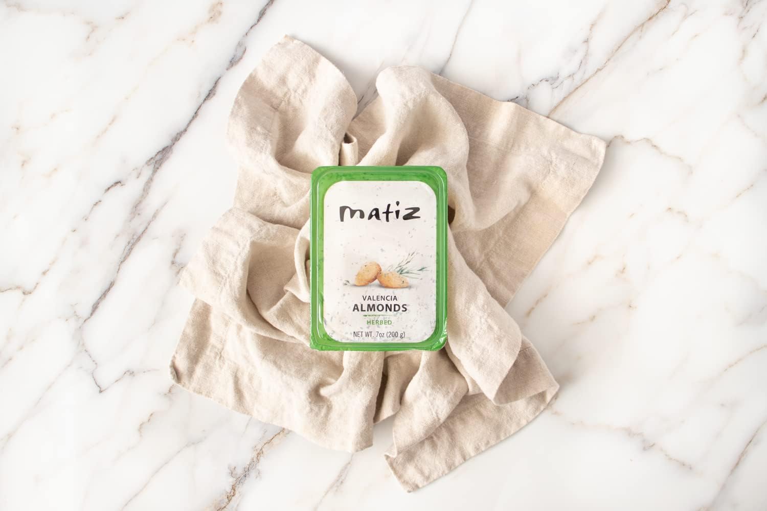 Q: What are Matiz Valencia Herbed Almonds made of?A: Matiz Valencia Herbed Almonds are crafted from high-quality Spanish Valencia almonds, lightly pan toasted in olive oil and seasoned with herbs, providing a rich and buttery flavor.