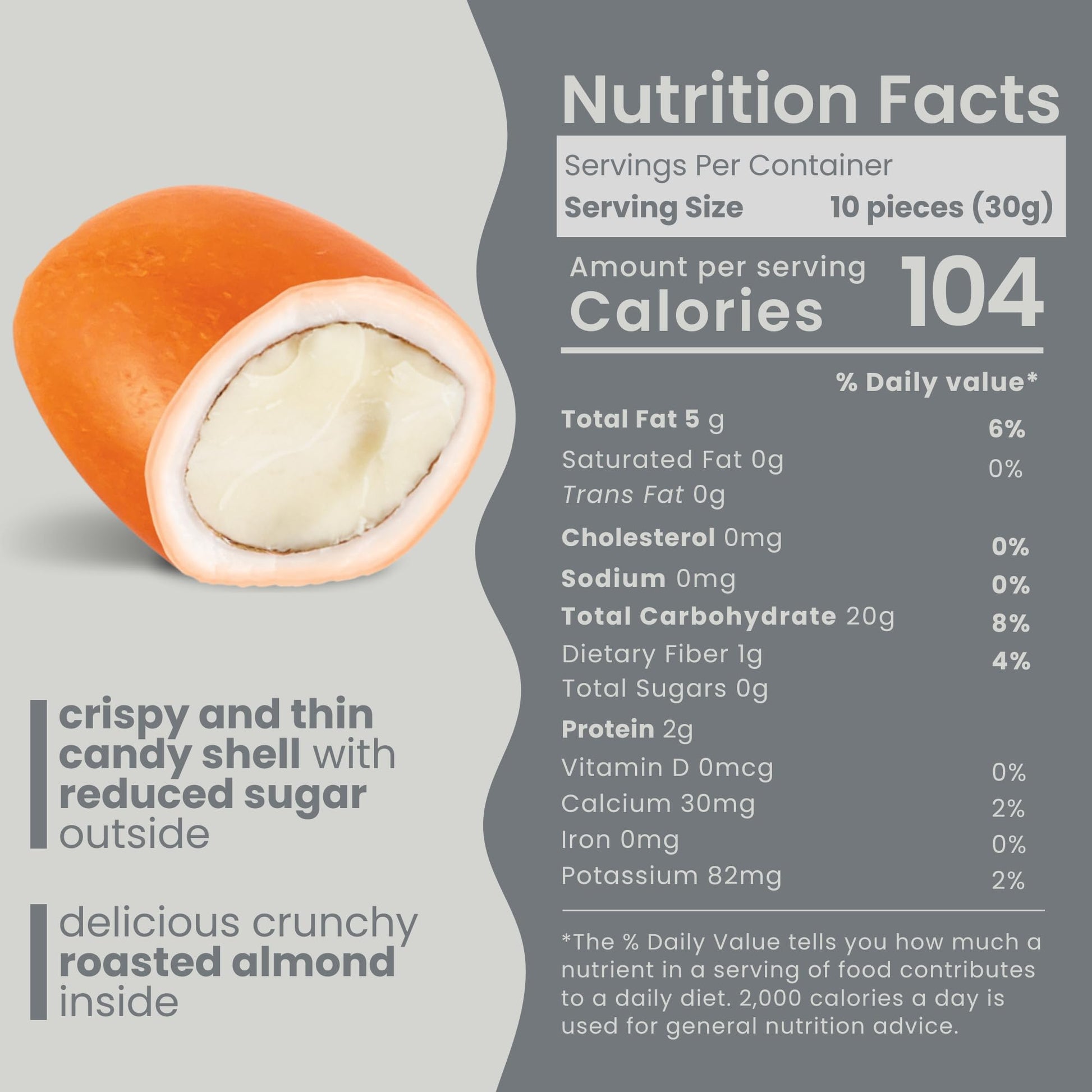 Q: Are these Jordan almonds suitable for sugar-restricted diets?A: Yes, these Jordan almonds are sugar-free, making them a great choice for individuals looking to reduce their sugar intake while still enjoying a sweet treat.