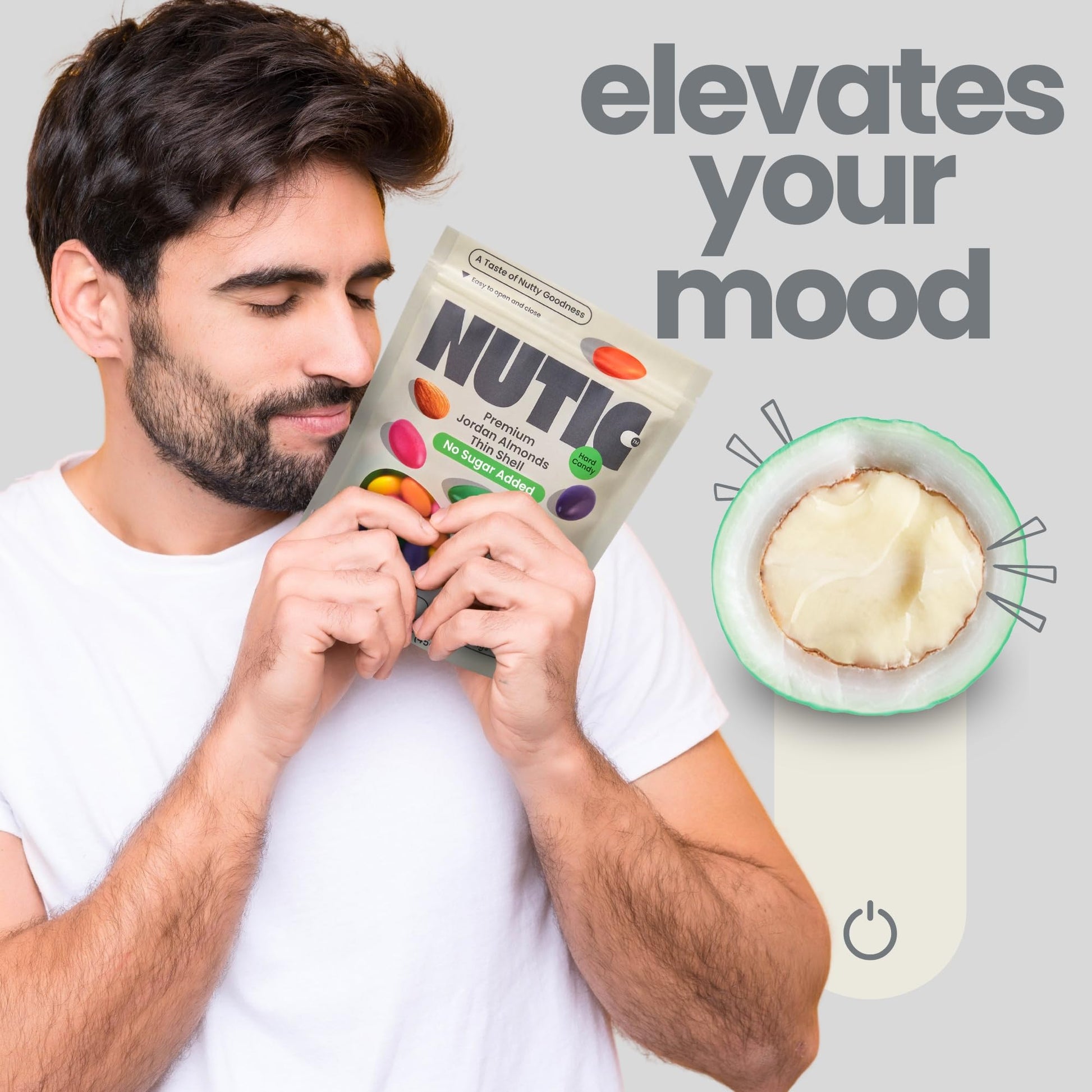 Q: What are Nutic No Sugar Added Jordan Almonds made from?A: Nutic No Sugar Added Jordan Almonds are crafted from high-quality almonds coated in a sugar-free candy shell. They are made in the USA using locally sourced ingredients to ensure freshness and quality.