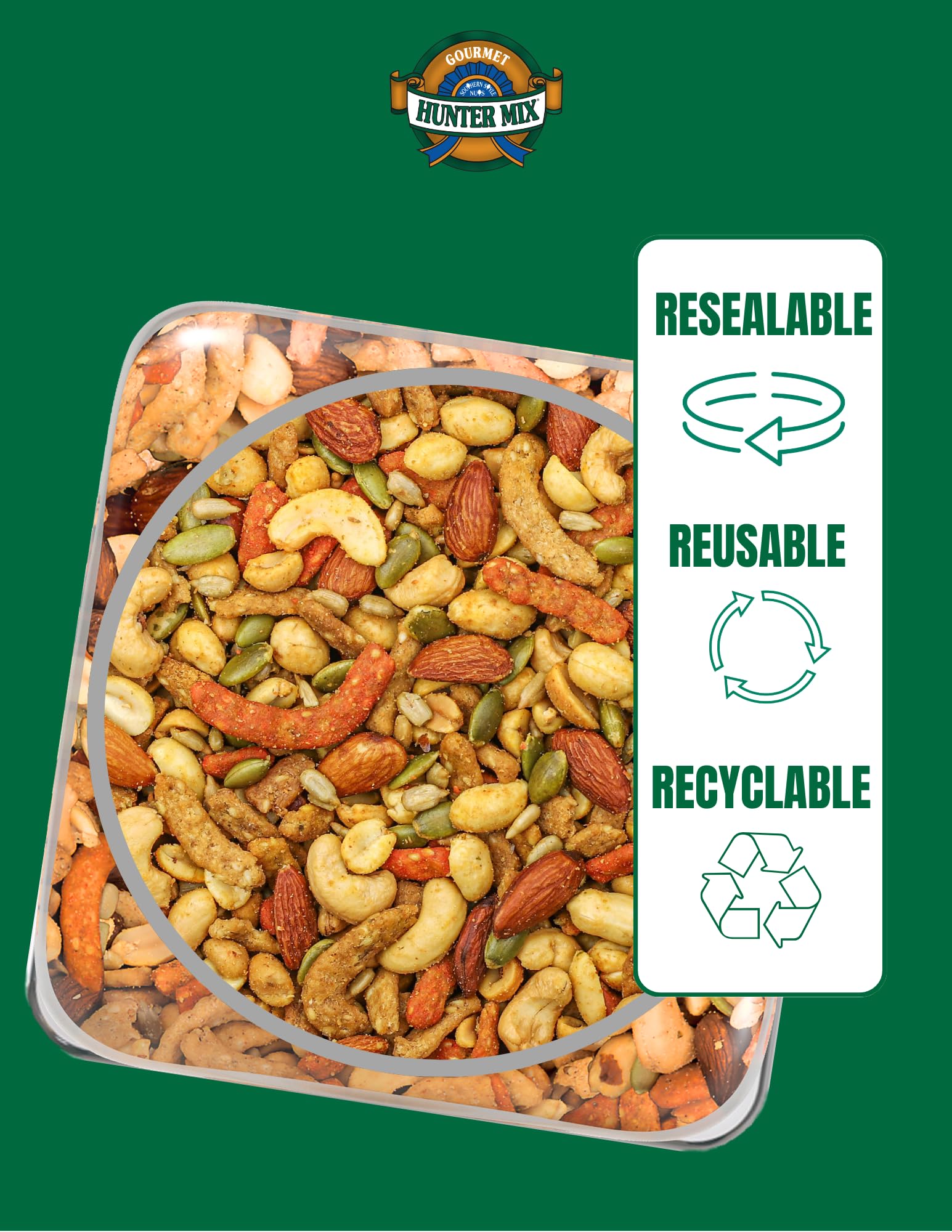 Southern Style Nuts Gourmet Hunter Mix is a one-size-fits-all trail mix for those of us who like savory snacks. With whole cashews, almonds, peanuts and a crunchy variety of sesame sticks and seeds, seasoned with our special blend of spices, it’s hard to decide what to eat first. So, whether you prefer “hunting” for individual items or just grabbing a handful on the run, please enjoy. Many words can be used to describe Southern Style Nuts — Delicious. Magnificent. Irresistible. But when it comes to producing quality products at a fair price, only one word is appropriate — unmatched. Our company was established as a simple purveyor of peanuts and has blossomed into a beloved brand known for distinctive and satisfying nut blends. Please enjoy and savor our products… for the love of snacking.
