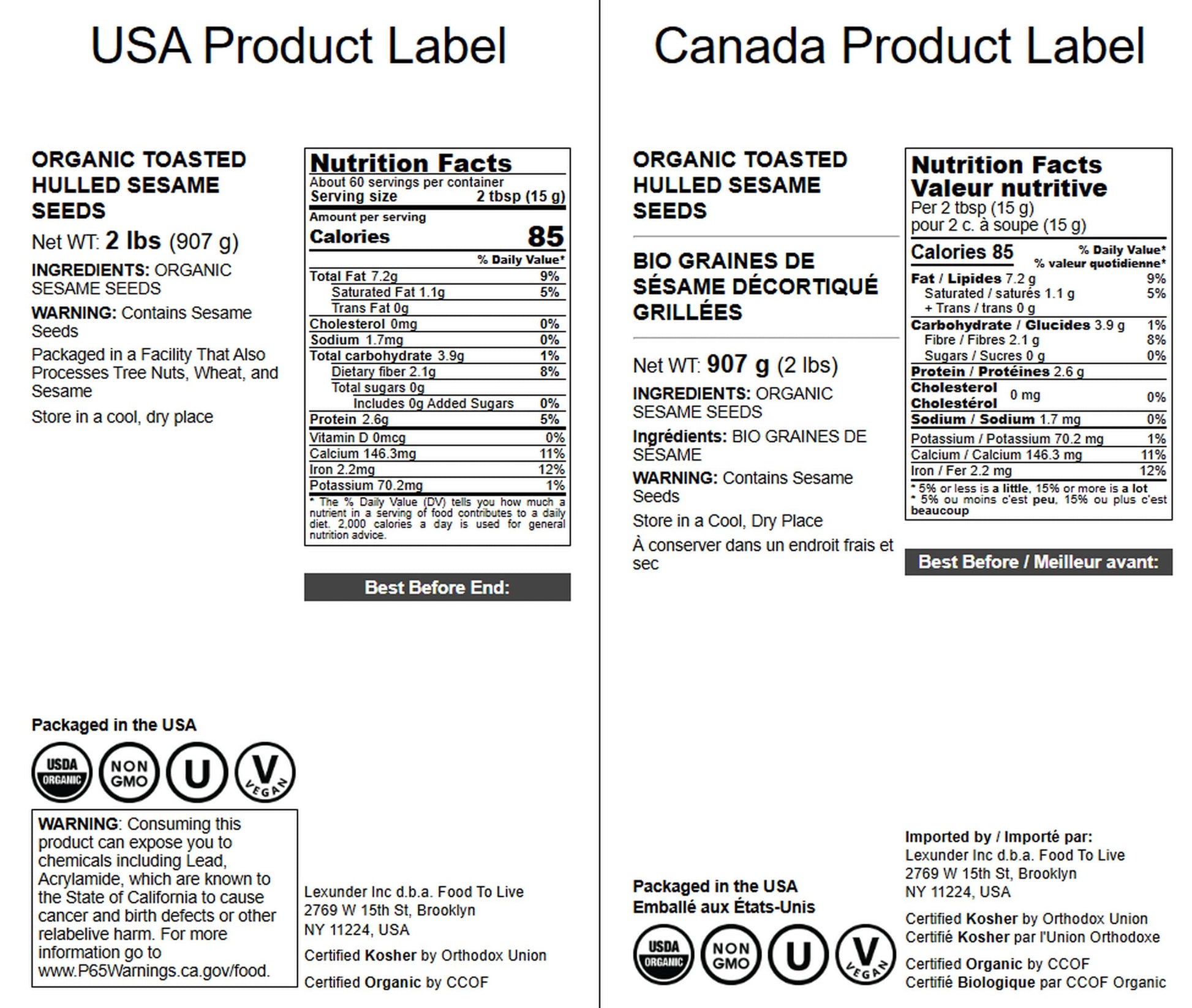 - Q: Do these sesame seeds contain any allergens? A: Food to Live Organic Toasted Hulled Sesame Seeds are gluten-free and contain no common allergens like dairy or nuts. However, it is always advisable to check the packaging for specific allergen information.