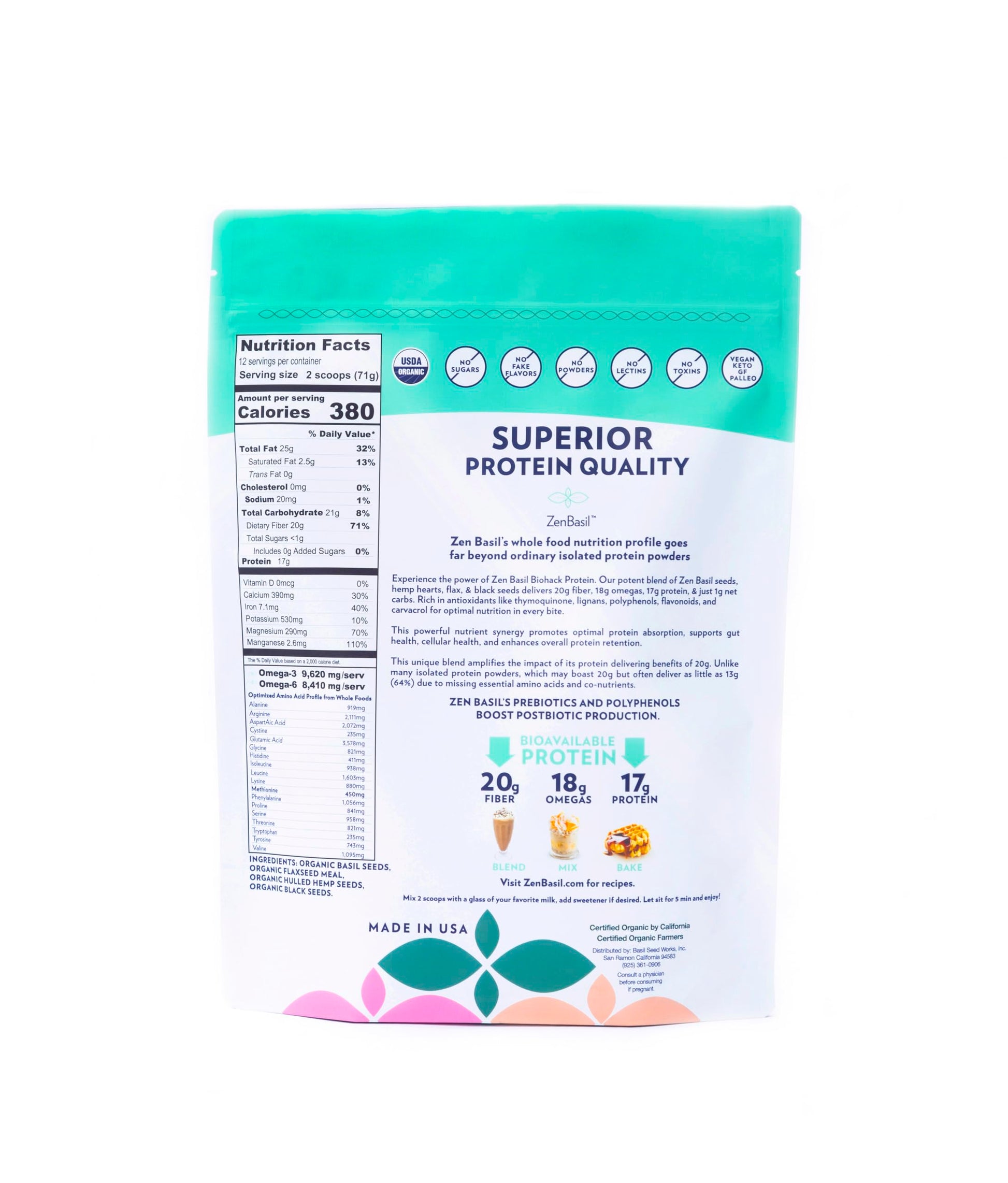 The Zen Basil Biohack is crafted with a thoughtful s of organic zen basil seeds, organic flaxseed meal, organic hulled hemp seeds, and organic black seeds. Each serving delivers an impressive nutritional profile, featuring 20g of fiber, 18g of essential omegas, and 17g of complete protein while maintaining just 1g of net carbs. This USDA organic certified product is free from gluten, toxins, lectin, and glyphosate, ensuring a clean choice for your daily nutrition needs. Rich in natural compounds, including thymoquinone, lignans, polyphenols, and flavonoids, Zen Basil Biohack offers comprehensive nutrition for those seeking optimal wellness.