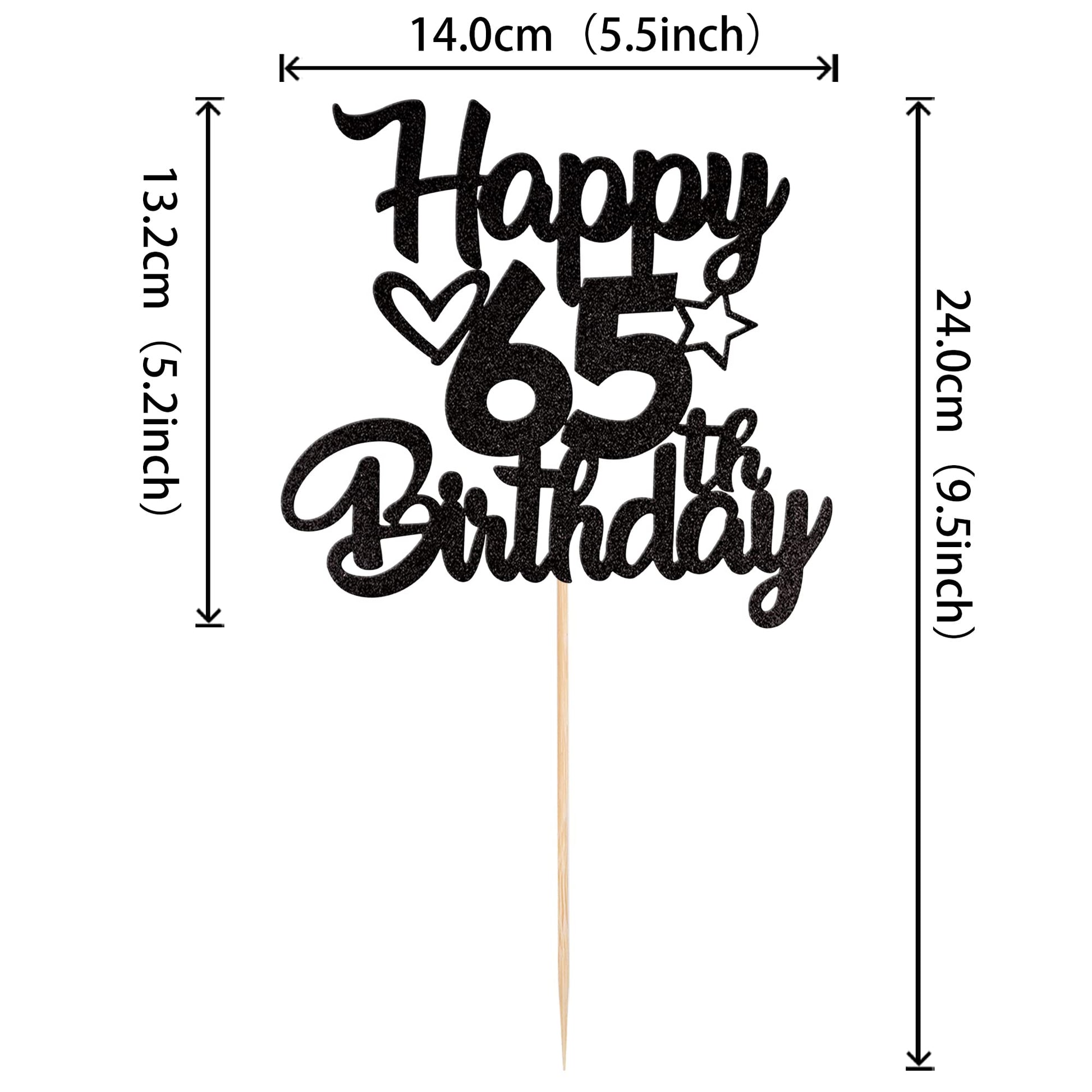 Q: What are the dimensions of the Happy 65th Birthday Cake Topper?A: The Happy 65th Birthday Cake Topper measures W 5.4 inches x H 9.2 inches (W 13.7 cm x H 23.3 cm) including the stick.
