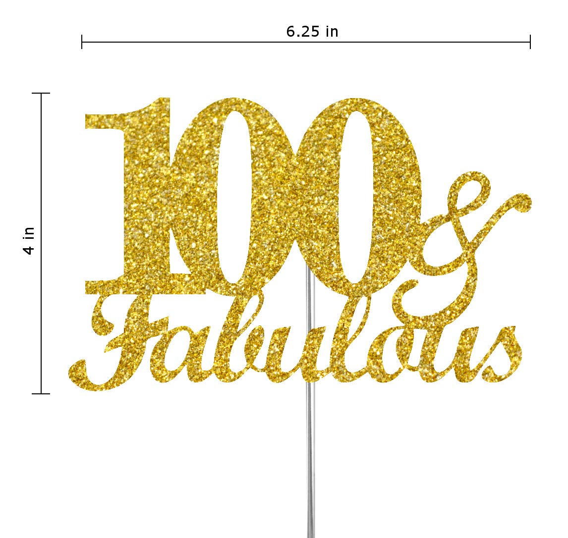 100 & Fabulous Cake Topper Gold Glitter, 100Th Birthday Party Decoration Ideas, Premium Quality, Sturdy Doubled Sided Glitter, Acrylic Stick Made In Usa (100Th)