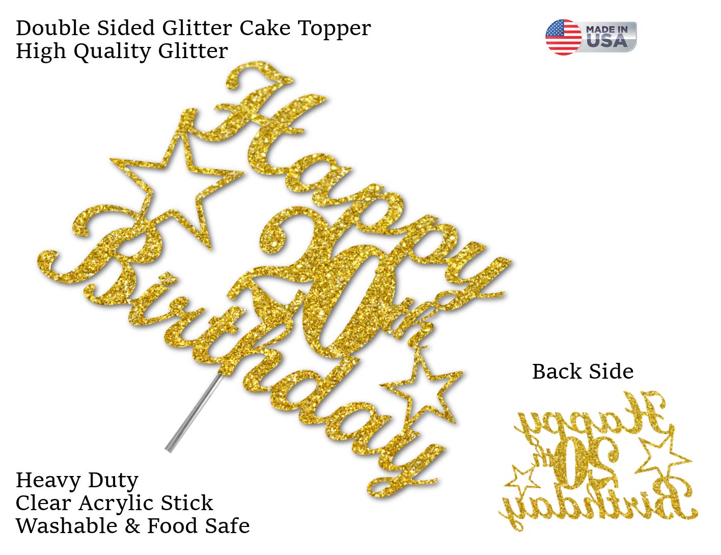 Q: What materials are used in the 20 Birthday Cake Topper?A: The 20 Birthday Cake Topper is made of premium quality double-sided heavy-duty glitter cardboard and features a food-safe acrylic stick for easy placement on your cake.
