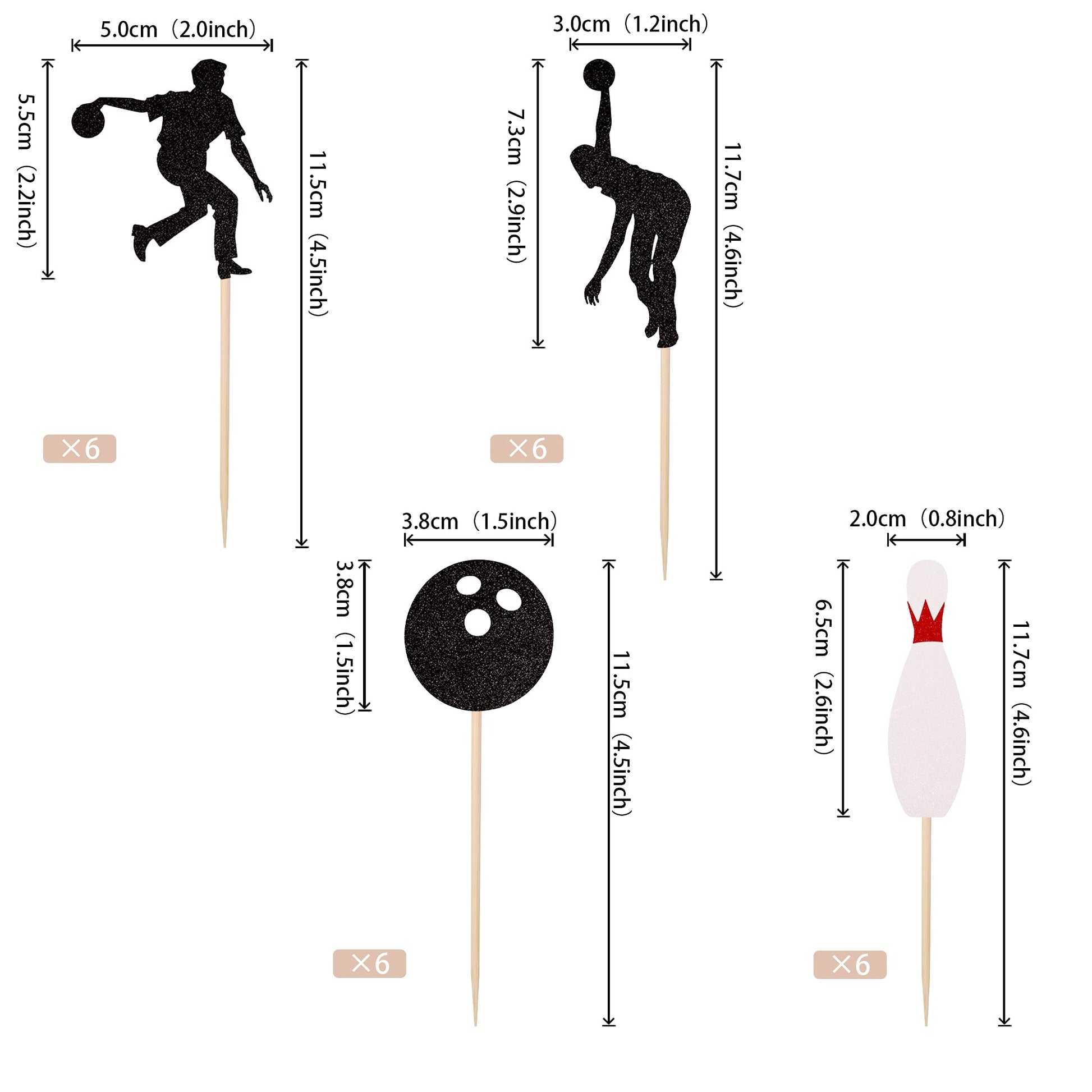 Q: What are the dimensions of the bowling cupcake toppers?A: The bowling cupcake toppers come in various sizes: 2*4.5 inches, 1.2*4.6 inches, 1.5*4.5 inches, and 0.8*4.6 inches, including the stick.