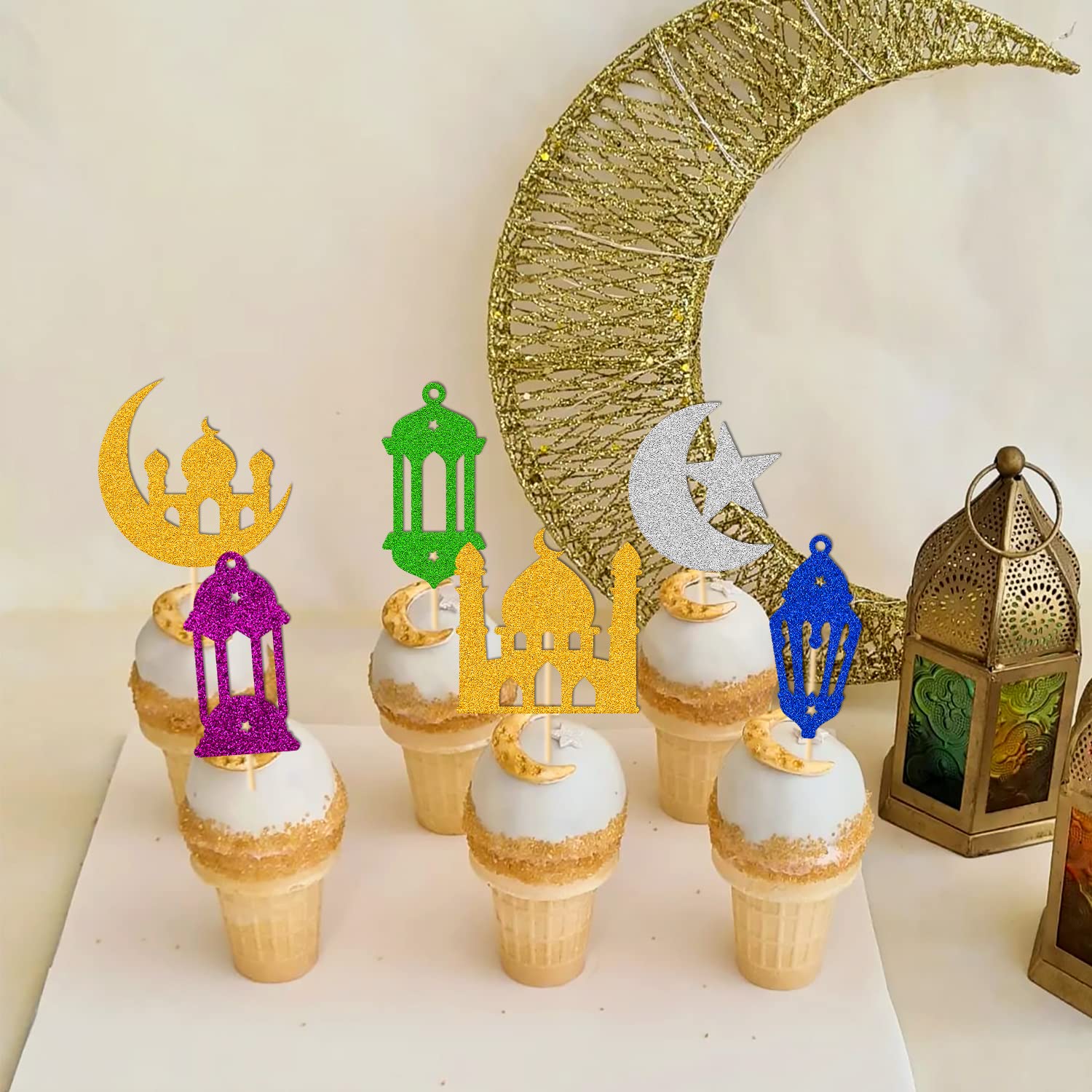 36 Pcs Eid Mubarak Cupcake Topper Star Moon Lantern Castle Theme Supplies For Muslim Islamic Eid Mubarak Festival Celebration Party Decorations