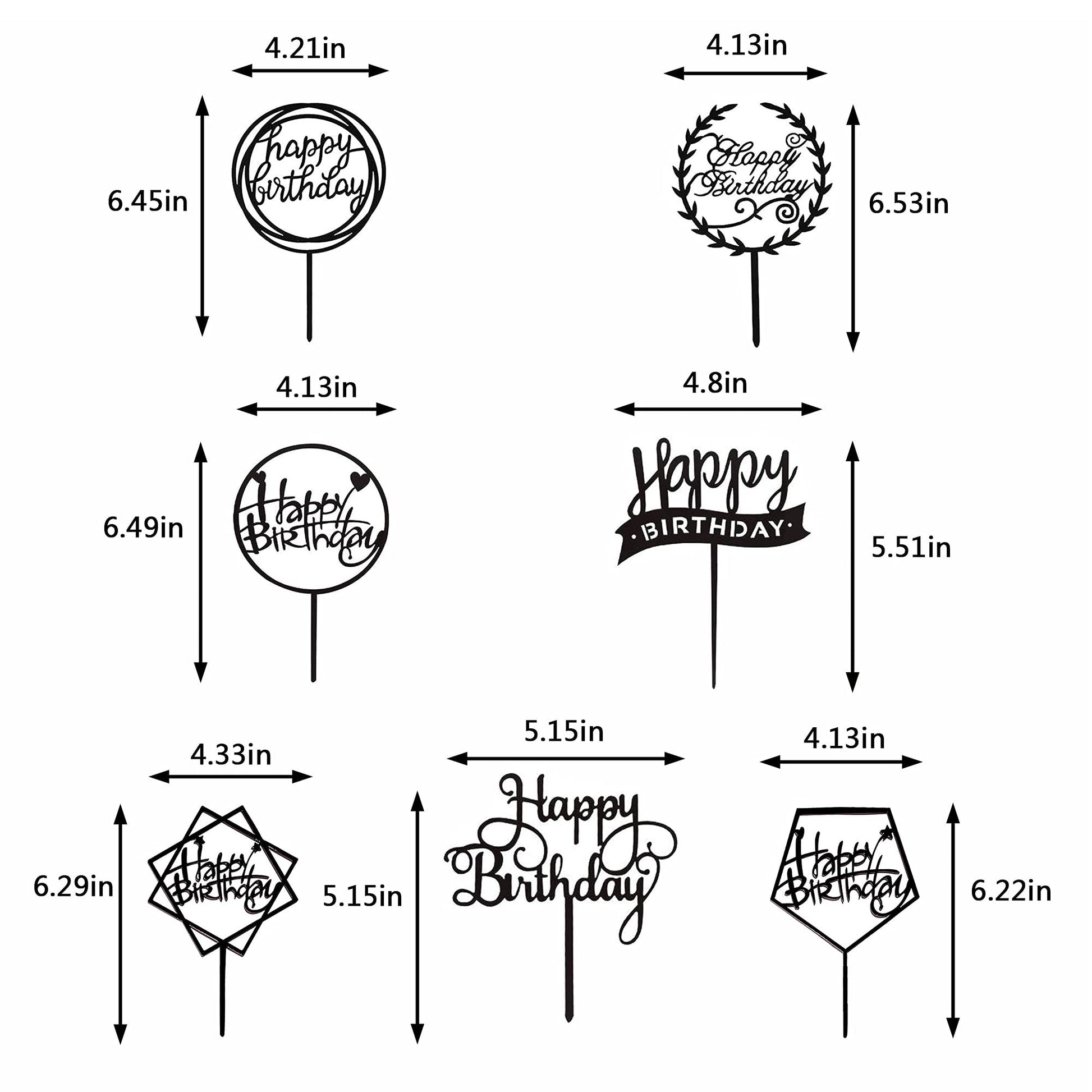 Q: What sizes do the cake toppers come in?A: The happy birthday cake toppers measure approximately 4.3 inches in width and 6.5 inches in height, with the included toothpicks bringing the total height to around 4.7 inches.