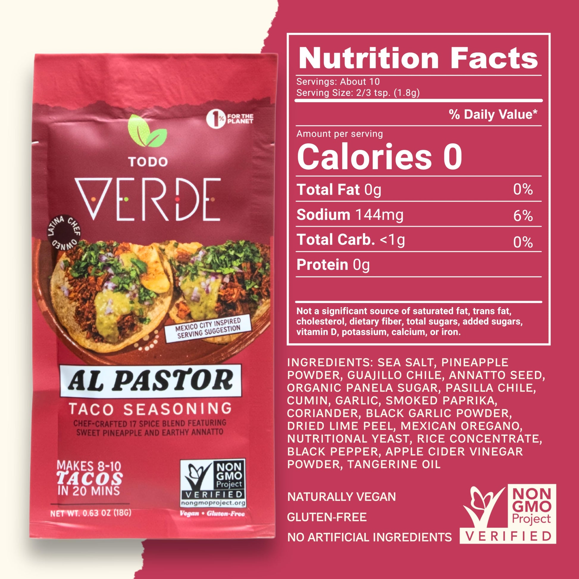 Al Pastor Seasoning - Todo Verde'S Al Pastor Seasoning Is Chef-Curated With Premium Real Ingredients Including Pineapple, Annatto, Black Garlic, Panela Sugar, Dried Lime Peel, Apple Cider Vinegar And Tangerine Oil. | All Natural Ingredients - Todo Verde Uses Only The Finest Natural Ingredients, Creating A Vegan, Gluten Free, Non-Gmo Seasoning Blend With No Artificial Preservatives. | Quick Recipe - Simply Use Our Seasoning Blend With 12-16 Oz Of Your Choice Of Protein Or Veggies And Oil To Make Tacos, Burritos, Tostadas In Just 20 Minutes! | True-To-Culture Flavor - Our Seasoning Blends Are Created To Celebrate Mexico