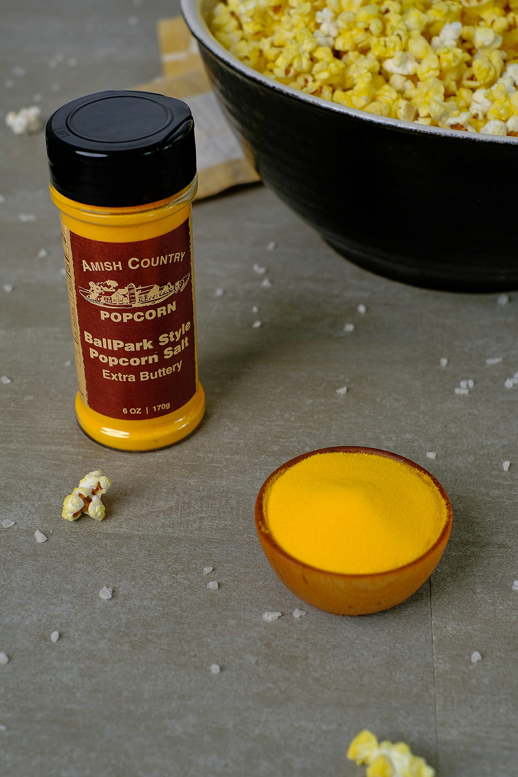 Q: What makes Amish Country Popcorn salt different from other popcorn seasonings?A: Amish Country Popcorn salt is unique due to its buttery flavor that evokes the experience of enjoying popcorn at the ballpark. It is also made from non-GMO ingredients and is free from preservatives.