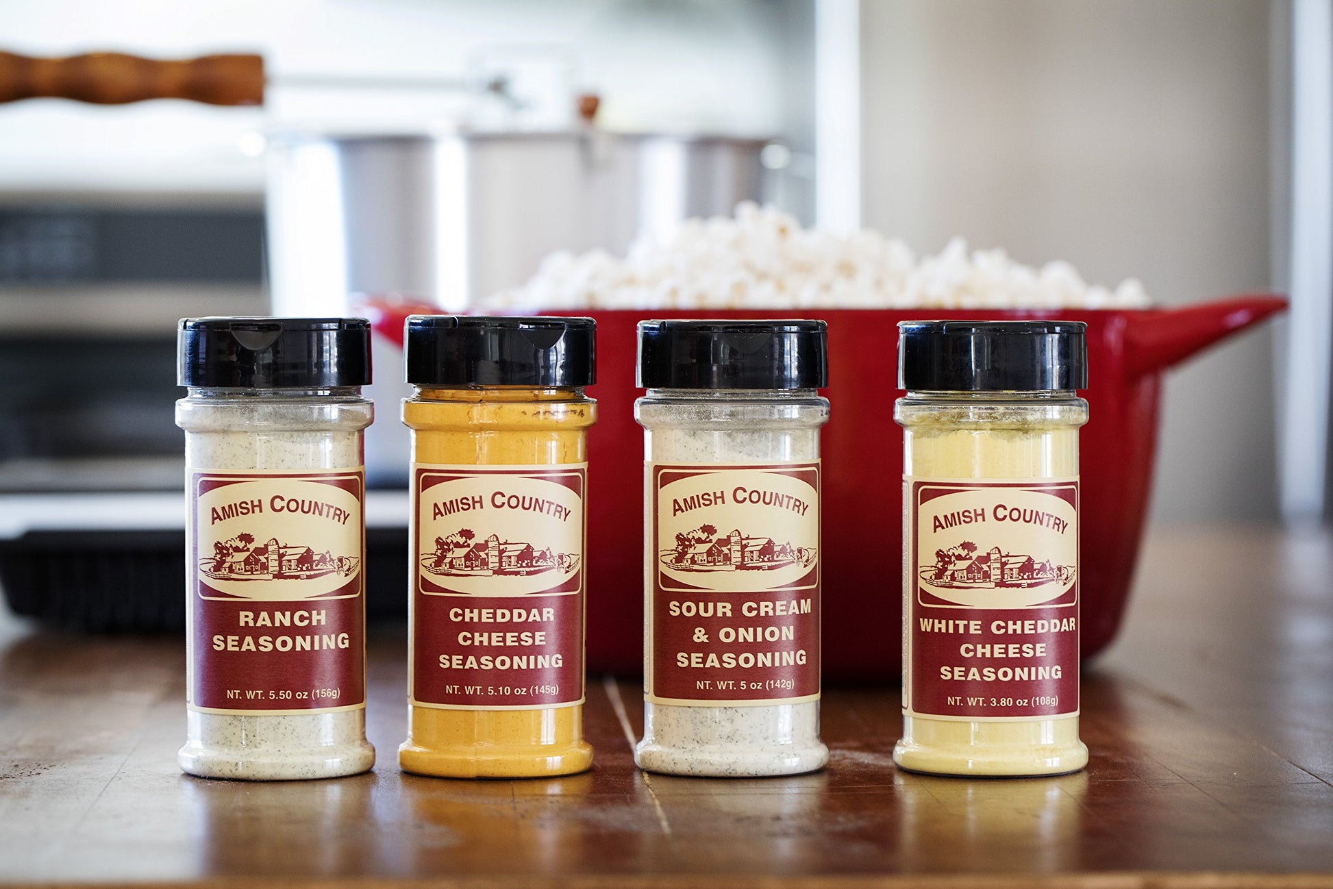 - Q: What flavors are included in the Amish Country Popcorn Seasoning Variety Pack? A: The Amish Country Popcorn Seasoning Variety Pack includes four delicious flavors: Cheddar, White Cheddar, Ranch, and Sour Cream & Onion.