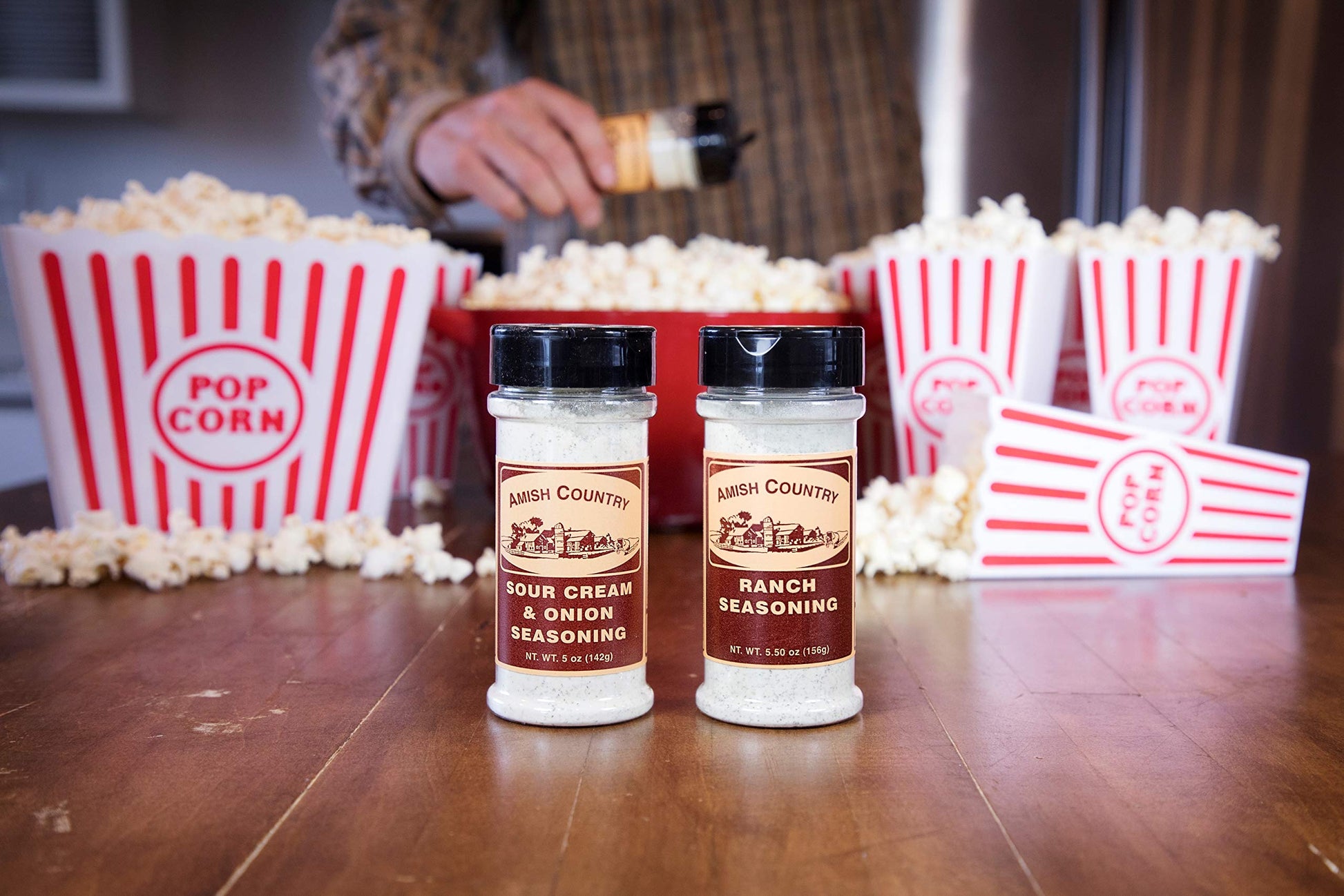 Q: What flavors are included in the Amish Country Popcorn seasoning variety pack?A: The Amish Country Popcorn seasoning variety pack includes two delicious flavors: Sour Cream and Onion and Ranch. Each pack contains a 5-ounce Sour Cream and Onion seasoning and a 5.5-ounce Ranch seasoning, perfect for enhancing your popcorn experience.