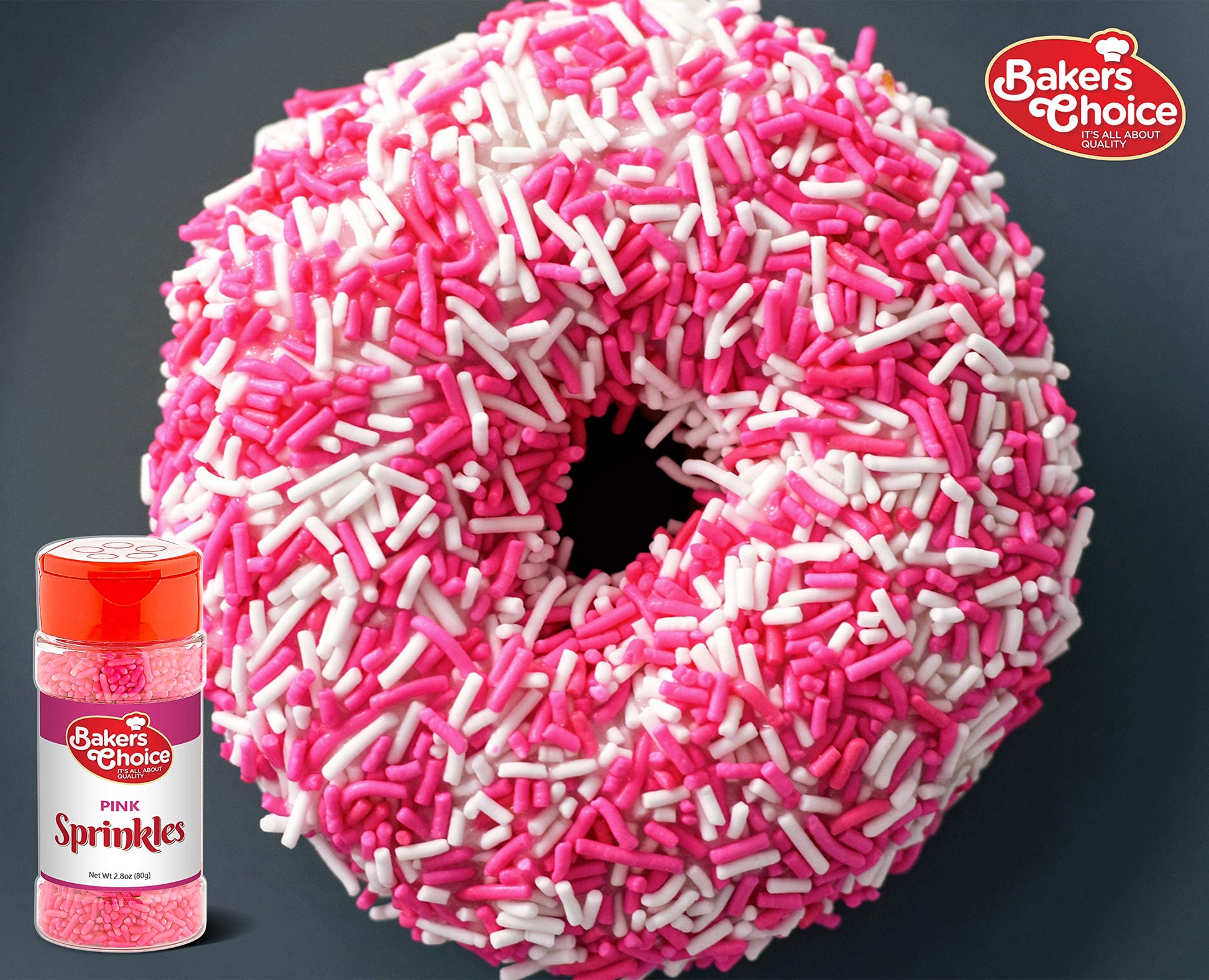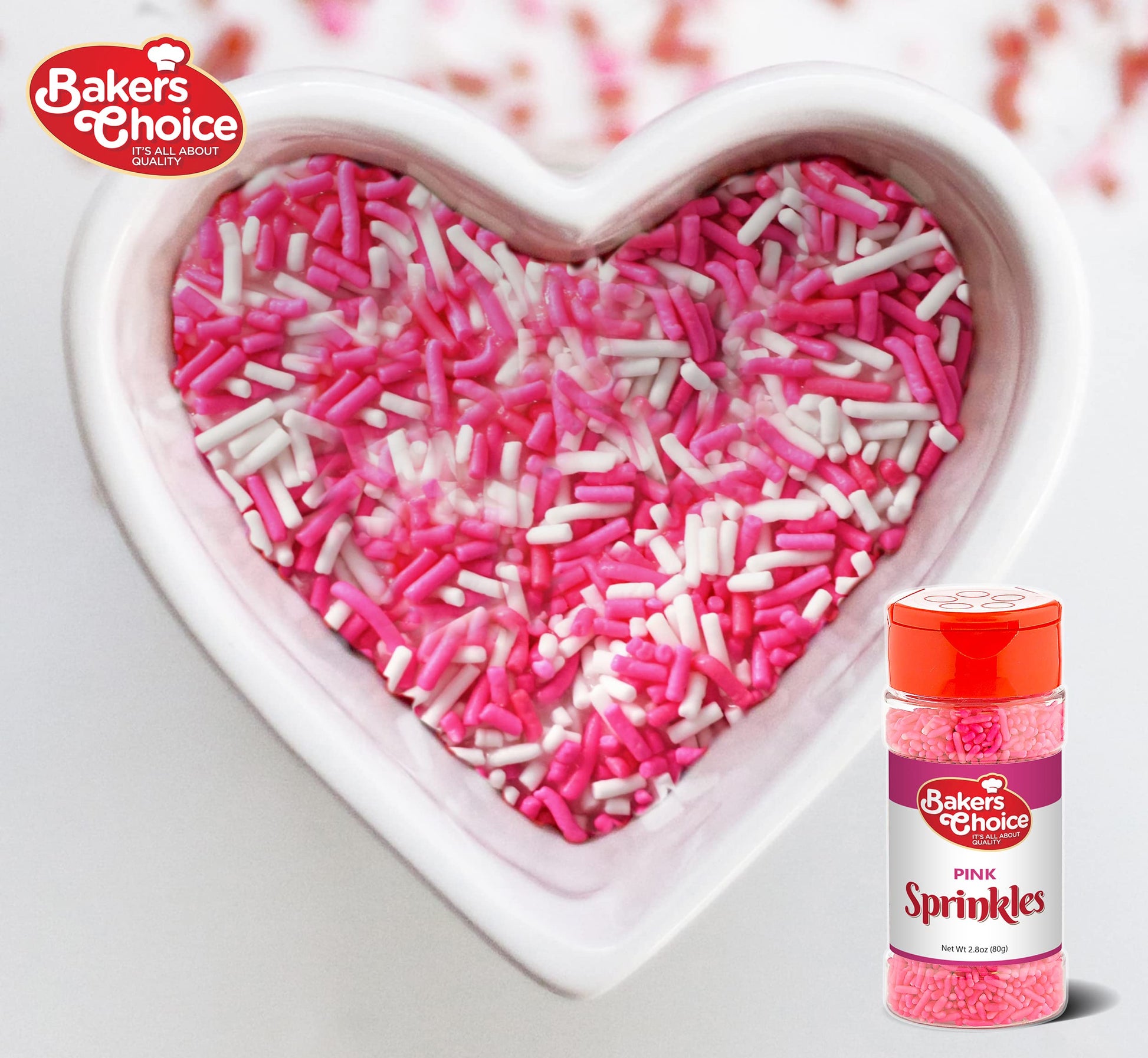 - Q: What are Baker's Choice Pink Sprinkles made from? A: Baker's Choice Pink Sprinkles are made from high-quality ingredients that are dairy-free, trans fat-free, and vegan. They are certified kosher, ensuring they meet dietary requirements for various consumers.