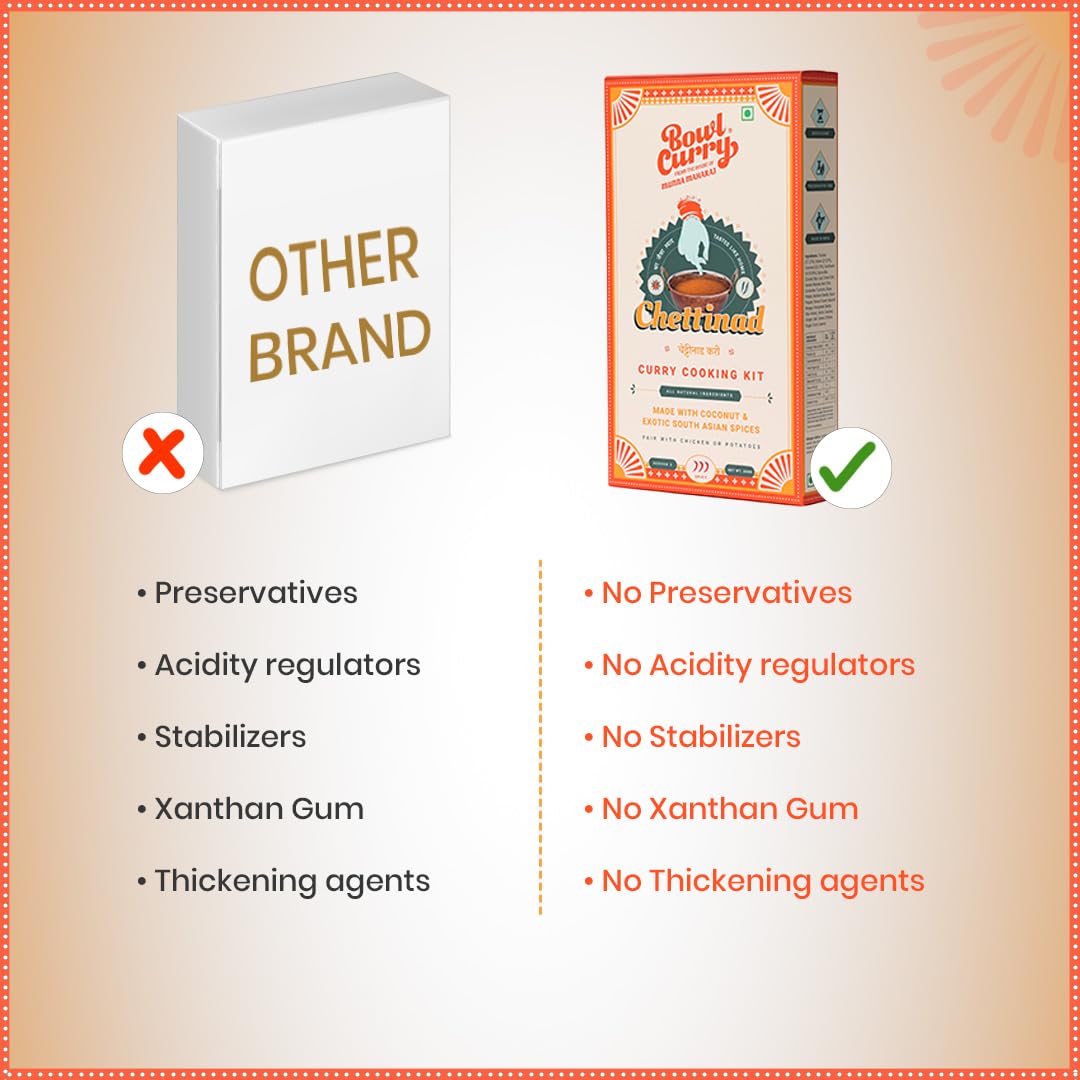 Q: How do I prepare the Bowl Curry Chettinad Chicken?A: To prepare the Bowl Curry Chettinad Chicken, simply cook your choice of chicken or vegetables, then add the ready-to-use gravy from the pouch and mix in the special spice mix. The entire cooking process takes under 15 minutes.