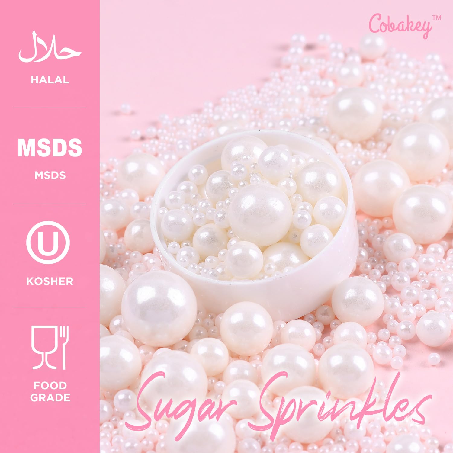 Q: What are Cobakey Pearl Sprinkles made of?A: Cobakey Pearl Sprinkles are made from sugar, carnauba wax, and are nut-free, ensuring they are safe for a variety of dietary needs.
