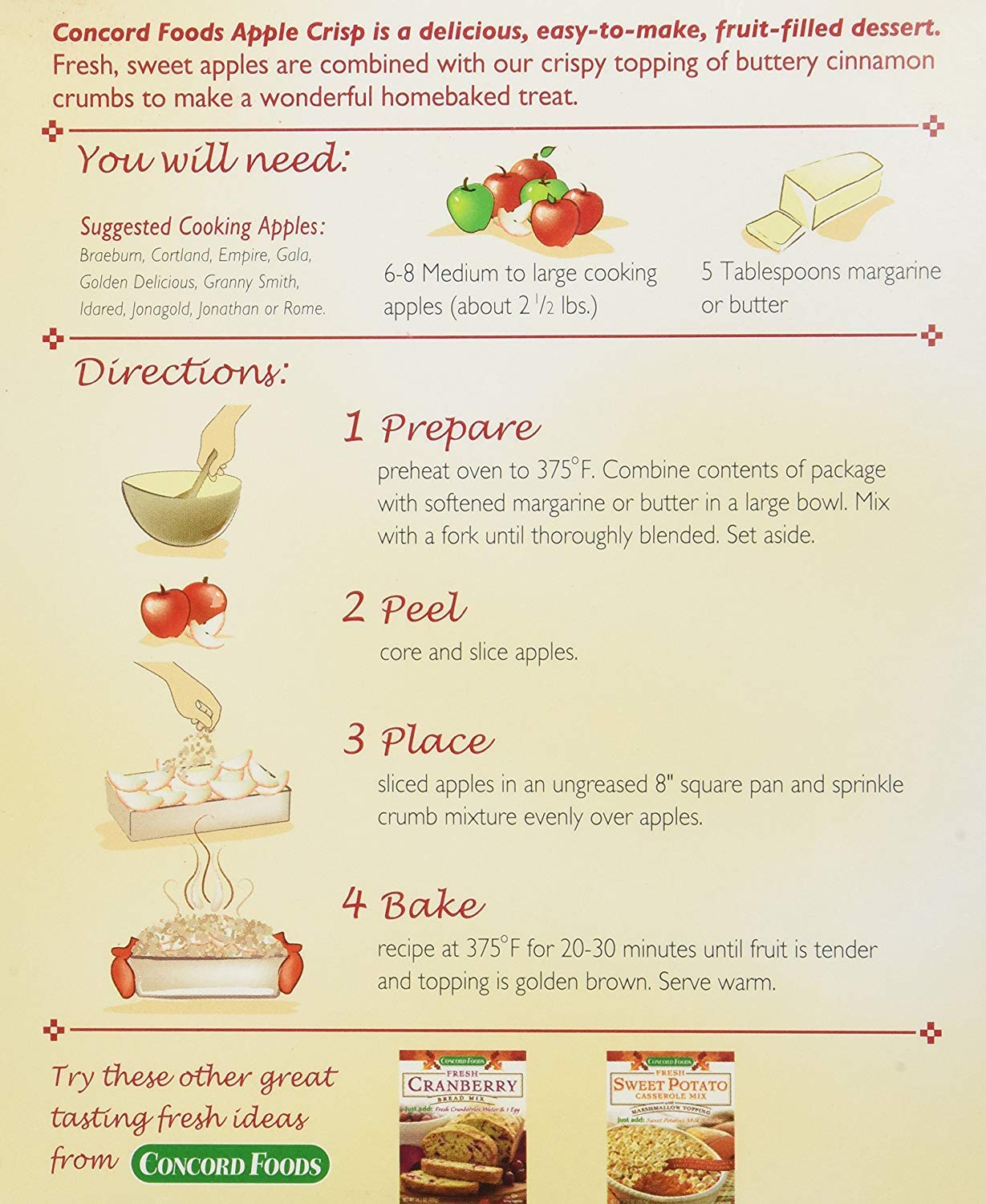 New packaging, same great product! You are buying a VALUE pack of 4 total b of dagselicious Apple Crisp Mix from Concord Foods. Easy to make! 9 Servings Per Mix! Also makes great peach or blueberry crisp! Impress your family and friends with this easy to make and delicious Apple Crisp Mix. Add 6-8 medium-large apples & five tablespoons of butter or margarine for a sweet, melt-in-your-mouth fruit dessert covered with a buttery, cinnamon crumb topping. Consider baking several because people are going to ask for more! Ingredients: Sugar, wheat flour (wheat flour, malted barley flour), rolled oats, spice, caramel color, natural butter flavor (from milk).